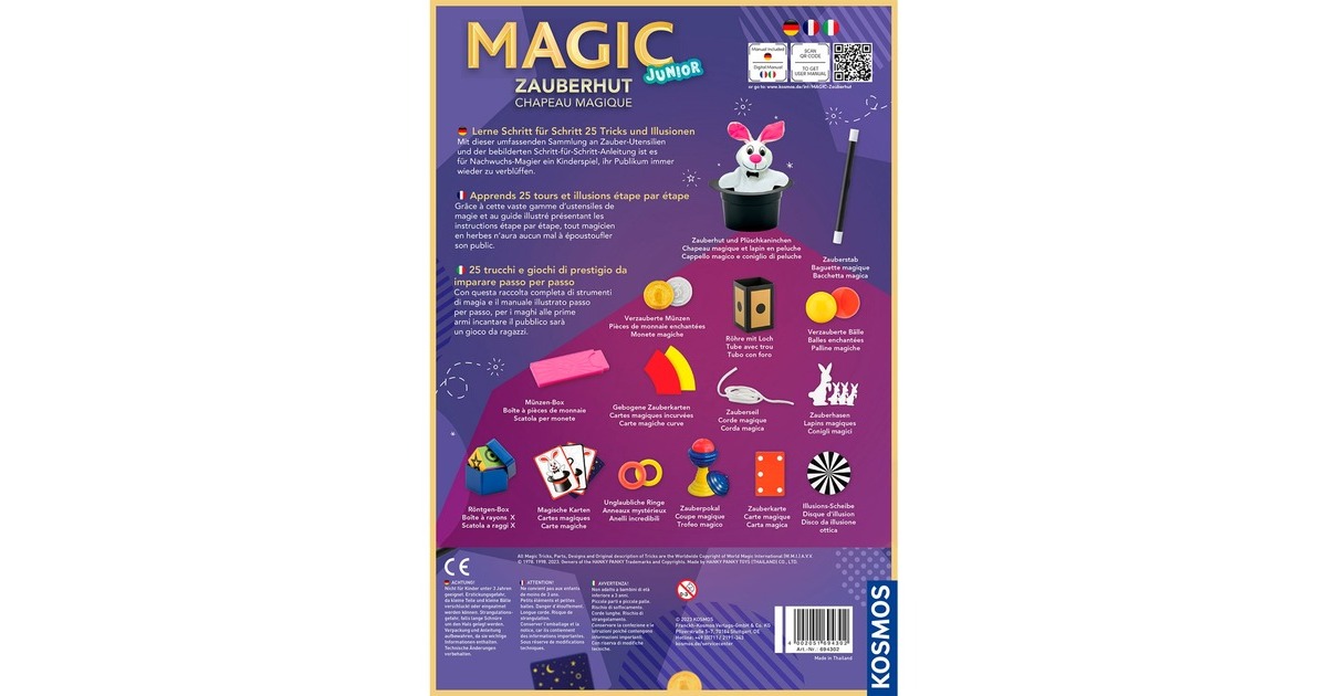 Zaubern lernen ist mit dem Magic Zauberhut kinderleicht! Zauberhut und Plüschkaninchen, verzauberte Münzen und magische Karten – in der Box stecken viele tolle Utensilien für die perfekte Show. Wie die 25 Tricks und Illusionen auf jeden Fall gelingen, zeigt die anschauliche farbige Anleitung. Sie leitet Kinder ab sechs Jahren Schritt für Schritt durch die Tricks. Eine Gliederung mit ansteigendem Schwierigkeitsgrad sorgt für Abwechslung bei der Aufführung. Neben tollen Tricks lernen die Kinder mit diesem Zauberkasten, ihr Publikum zu verblüffen und stärken nebenbei ihre Konzentration und Selbstbewusstsein.Art.-Nr.: 1904842