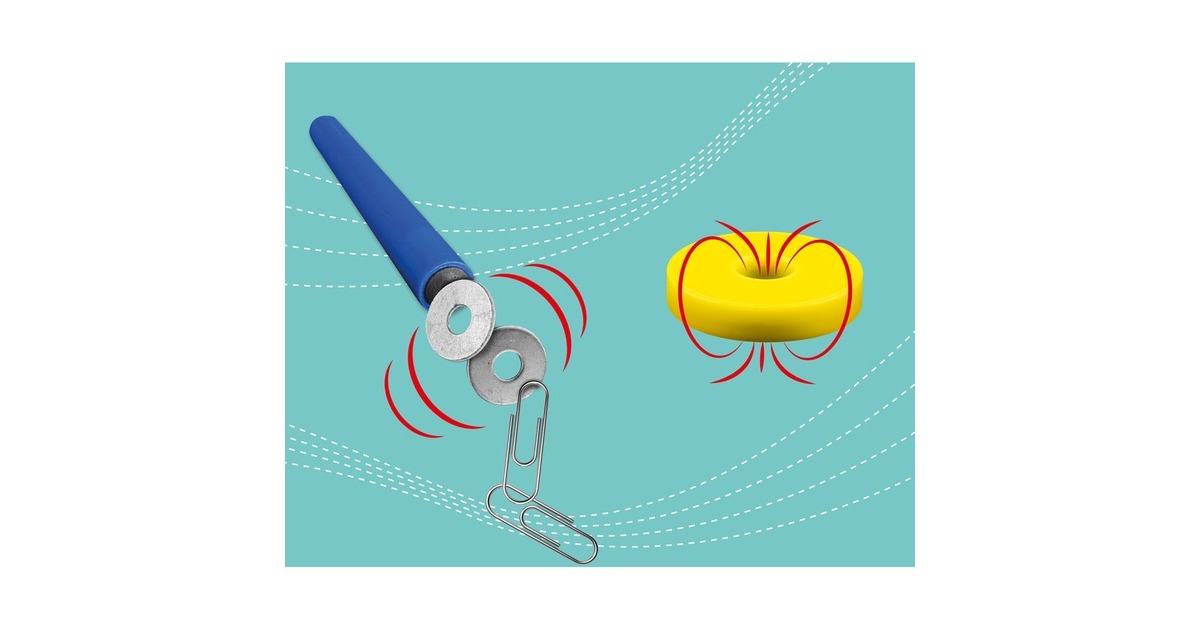 Magnet-Stab, Box mit Eisenpulver, Ringmagnet, Garn, 3 Unterlegscheiben, 3 Büroklammern, 3 kleine Papierbögen, 2 größere doppelseitig bedruckte Papierböge, Anleitung in Bildern |