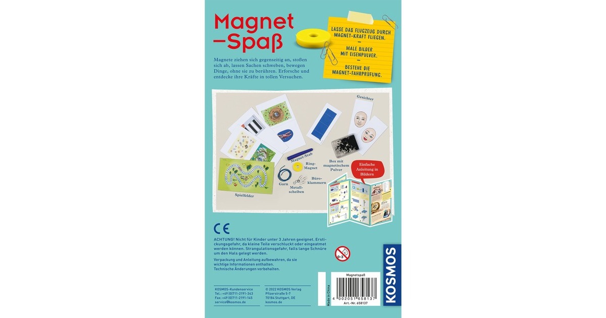 Den magnetischen Kräften auf der Spur! Aber sind die eigentlich wahrnehmbar!? Mit vielen spielerischen Experimenten machen Kinder zwischen 6 und 10 Jahren magnetische Kräfte sichtbar. Gegenstände ohne Berührung schweben lassen? Kein Problem! Vom magnetischen Mülltrenner bis zum fliegenden Ufo – hier haben die Magnete eine Menge Tricks auf Lager! Und es gibt sie in zwei unterschiedlichen Formen für ganz verschiedene Versuche. Dabei erleben die Kinder hautnah, wann sich Magneten anziehen oder abstoßen und sie können mit den Materialien auch ganz frei experimentieren. Mit Hilfe der bebilderten Anleitung werden die Magnete-Tests in diesem KOSMOS Experimentierset fast schon zu einer kleinen Zaubershow. Ein tolles Geschenk für Zwischendurch!
