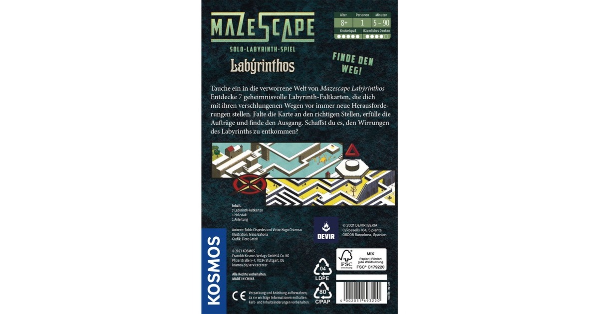 Mit "Mazescape Labyrinthos" kommt eine Knobelaufgabe mit bis zu 90 Minuten Dauer - und dies in einer Welt mit jeder Menge verworrenen Wegen. Mit sieben Faltkarten wird das Labyrinth nach und nach erschlossen. Dabei wird die Karte gefaltet, um neue Wege zu erschließen. Hilfreich sind dabei der Holzstab und der Kompass - mit ihnen gilt es, den weißen Pfaden zu folgen. Dieses Solo-Labyrinthspiel kommt in einer praktischen Magnetbox, womit es gut für den Einsatz unterwegs geeignet ist.Art.-Nr.: 100022285