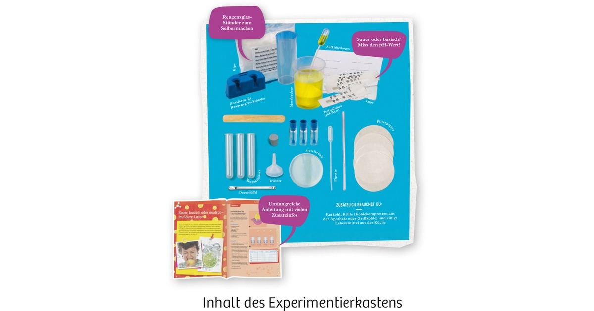 3 Reagenzgläser, Messlöffel, Pipetten, 15 runde Filterpapiere, Petrischale, Trichter, Teststäbchen, Lupe, 2 Messbecher, 3 Döschen mit Deckellöffel, Gips-Gussform für Reagenzglasständer, Gips, Gummistopfen und farbig illustrierte Anleitung. |