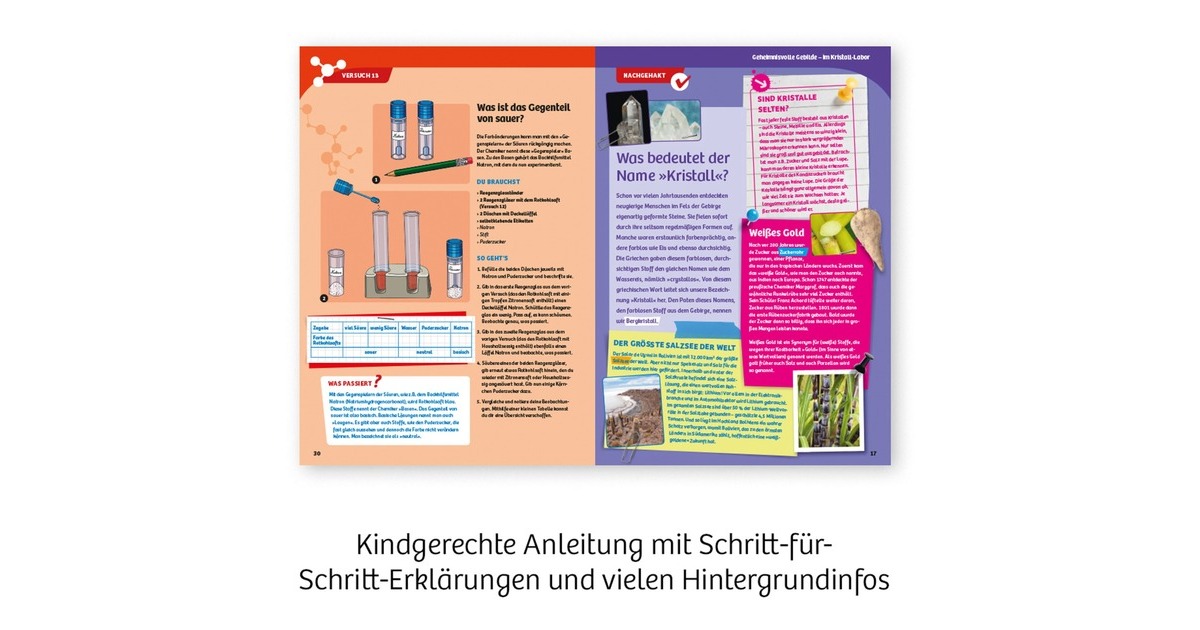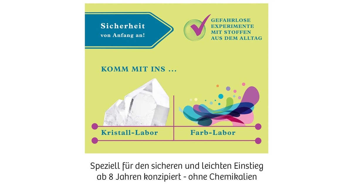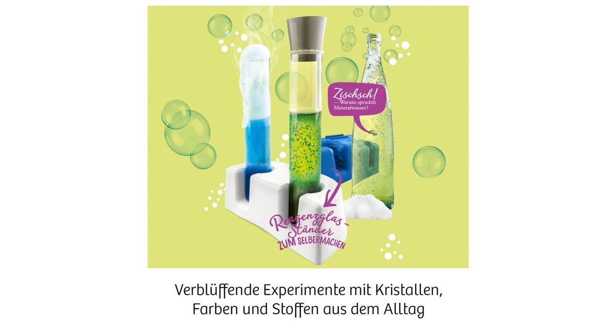 Mit diesem reizvollen Einsteiger-Experimentierkasten erforschen Kinder ab acht Jahren die Welt der Stoffe. Kristalle, Farben, Gase und vieles mehr werden genauer unter die Lupe genommen. Woraus besteht die Farbe von Filzstiften? Wie wachsen in einer Salzlösung Kristalle? Was sprudelt im Mineralwasser? Viele alltägliche Produkte werden chemisch untersucht.Art.-Nr.: 1521642