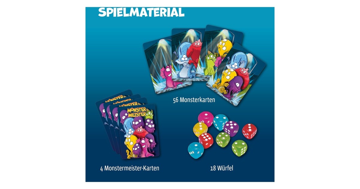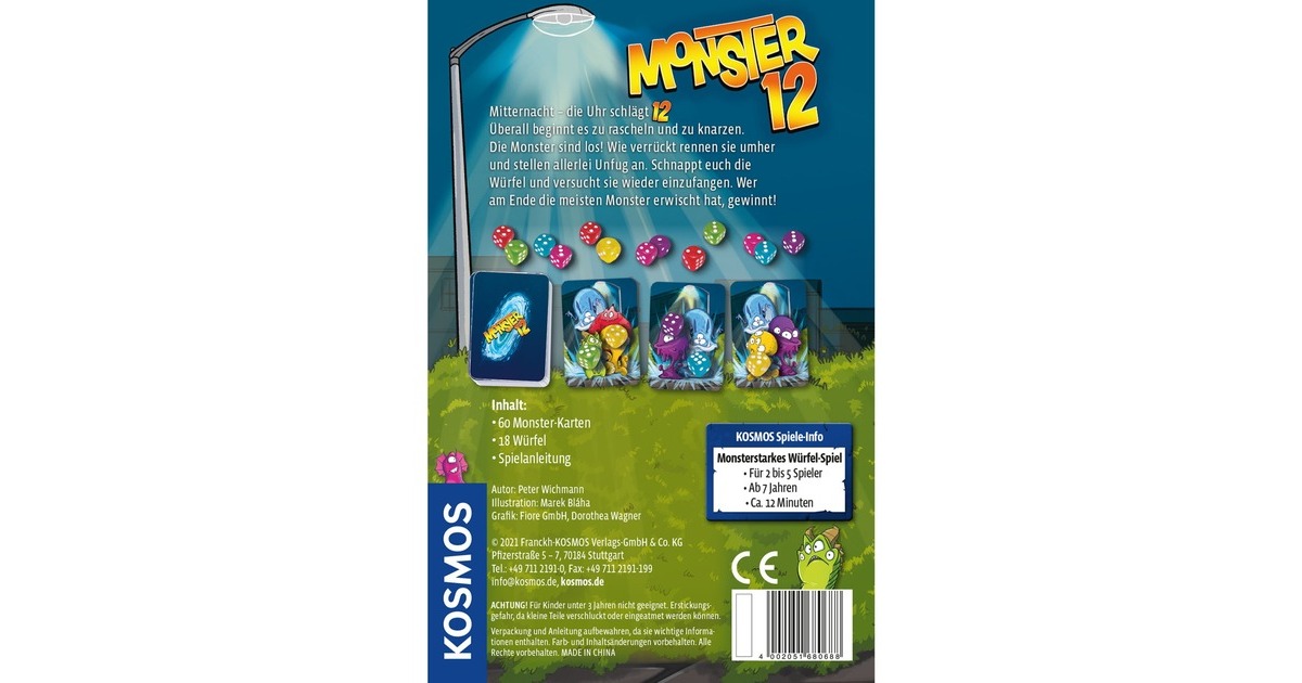 Mitternacht ist Monster-Zeit! Punkt 12 Uhr beginnt der große Spaß und die frechen Kerlchen kommen aus ihren Verstecken. Sie laufen hin und her und haben nur Unsinn im Kopf! Wer fängt die wilde Bande wieder ein? 2 – 5 Spieler ab 7 Jahren geben in diesem Familienspiel alles! Dank der kurzen Regeln beginnen sie sofort mit dem Würfeln. Der Spieler, der gerade am Zug ist, darf nur die drei Würfel nehmen, die farblich zu den Monstern auf den aufgedeckten Karten passen. Ist die Augenzahl des jeweiligen Monsters erreicht? Dann kann er die Würfel auf dem betreffenden Monster ablegen. Gewonnen hat der Spieler, der 12 Monster in unterschiedlichen Farben geschnappt hat. Das handliche Reisespiel in toller Verpackung mit Magnetverschluss ist ab sofort immer mit dabei!Art.-Nr.: 1733377