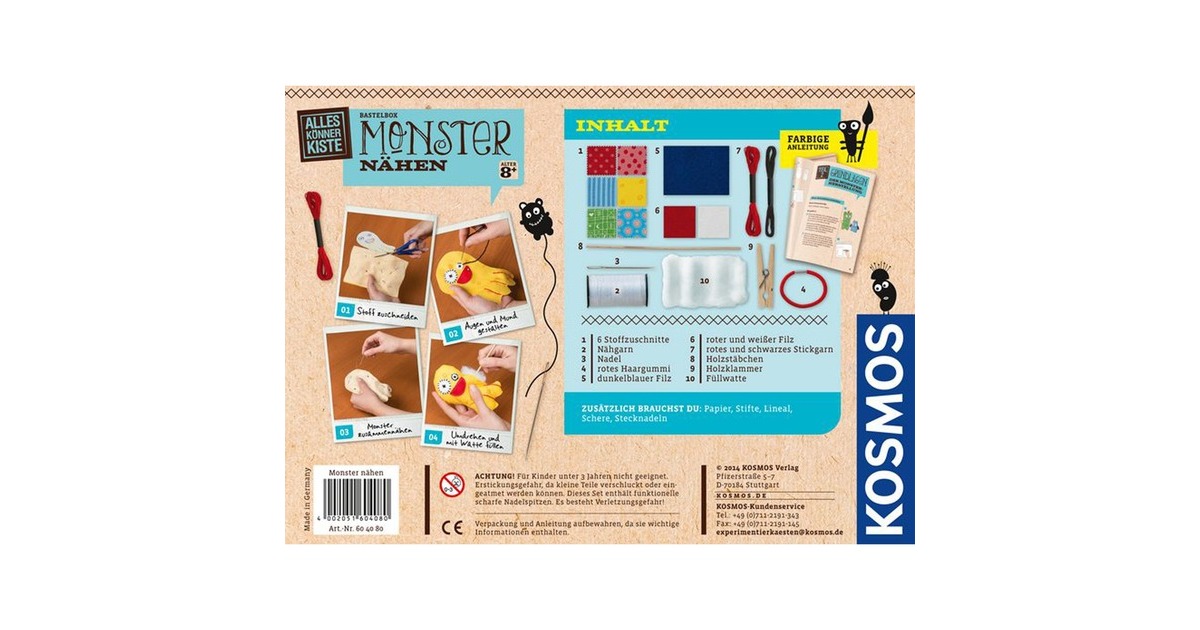 Ziel der KOSMOS AllesKönnerKiste „Monster nähen“ ist es, echte Kreativität zu fördern und jungen Monster-Designern die Möglichkeit zur freien Entfaltung zu bieten. Schließlich ist jedes Ungeheuer einzigartig – und genauso einmalig sollen auch die Bastelergebnisse der Nachwuchs-Schneider sein. Daher enthalten die AllesKönnerKisten auch keine vorgefertigten Modelle oder Schablonen. In der dreiteiligen Anleitung gibt es zunächst ausreichend Platz, um das eigene Monster zu entwerfen. Welche Form und Farbe hat es? Wie viele Augen? Und wie viele Beine? Anschließend folgen die Grundtechniken des Nähens. Und wer noch mehr Inspiration sucht, erhält in Teil drei zusätzliche Anregungen und Anleitungen, wie er dem Lieblingsungeheuer seinen ganz eigenen Charakter verleiht.Art.-Nr.: 1187420