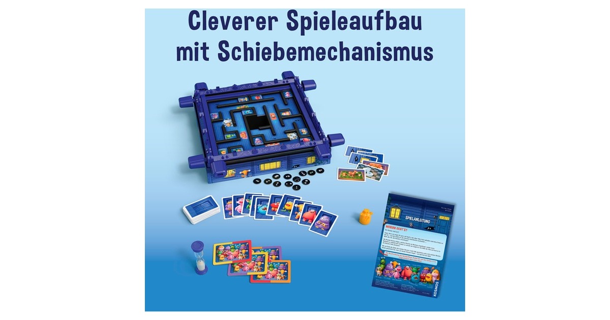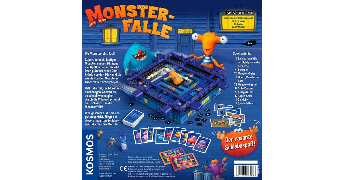 In der Villa sind die Monster los - und sorgen dabei für mächtig Spaß! Aber dann steht Oma Frieda vor der Tür – und die würde vor den Monstern fürchterlich erschrecken. Die Monster müssen daher ganz schnell eingefangen werden. Dabei hilft der clevere Spieleaufbau mit Schiebemechanismus. Die Spieler schieben sie so schnell wie möglich durch die Villa und schubsen sie dann – schwups – in die Monsterfalle! Wer geschickt ist und sich gut mit den anderen Kindern abspricht, fängt bei diesem rasanten Schiebespaß die meisten Monster.Art.-Nr.: 1849263