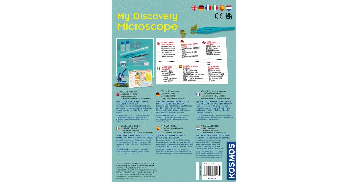 Mikroskop (bis zu 600fache Vergrößerung) mit batteriebetriebener LED-Beleuchtung, Präparierzubehör (Objektträger (Kunststoff), Deckglasfolien, Pipette, Pinzette, Präpariernadel, Probengefäße), farbige Anleitung |