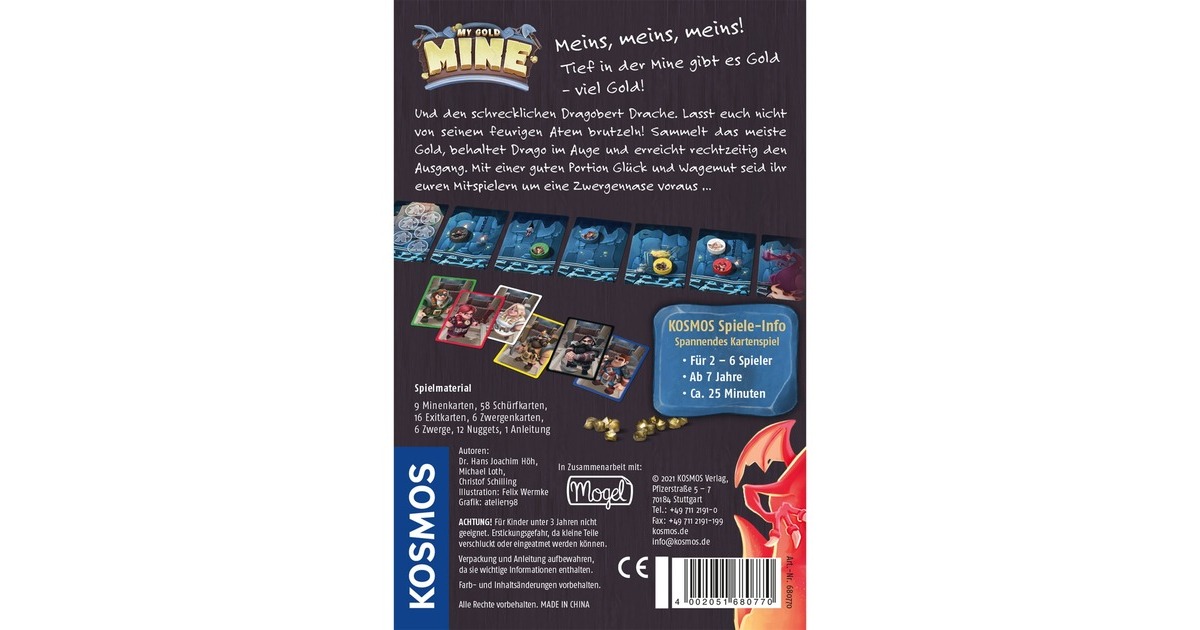 Diamanten, Edelsteine, Gold – ein unermesslicher Schatz verbirgt sich tief in der Höhle. Jeder Spieler verwandelt sich in einen Zwerg und schürft Gold-Nuggets. Doch aufgepasst! Der Hüter des Berges, der Feuer speiende Drache, hat es auf die Zwerge abgesehen und nimmt die Verfolgung auf. Wer kann die Goldmine mit den meisten Nuggets verlassen und wer ist zu gierig und wird vom Drachen geschnappt? Mit kurzen Regeln starten bis zu 6 Spieler in ein aufregendes Kartenspiel, bei dem sich der Gewinner mit ein wenig Glück und Geschick den größten Schatz sichert. Das handliche Reisespiel in toller Verpackung mit Magnetverschluss ist ab sofort immer mit dabei!Art.-Nr.: 1732722