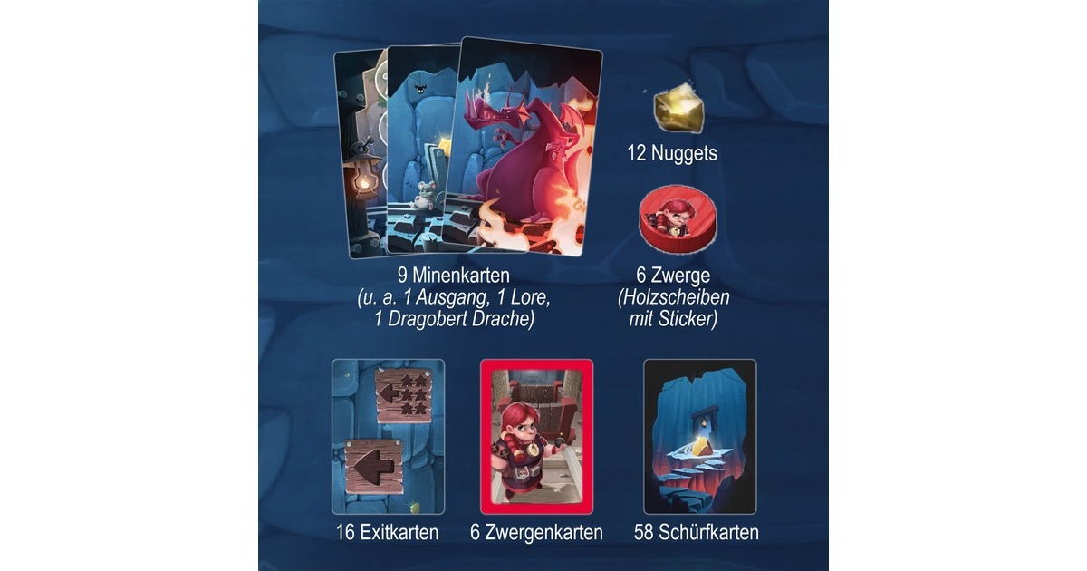 9 Minenkarten, 58 Schürfkarten, 16 Exitkarten, 6 Zwergenkarten, 6 Zwerge (Holzscheiben), 12 Nuggets, 1 Spielanleitung |