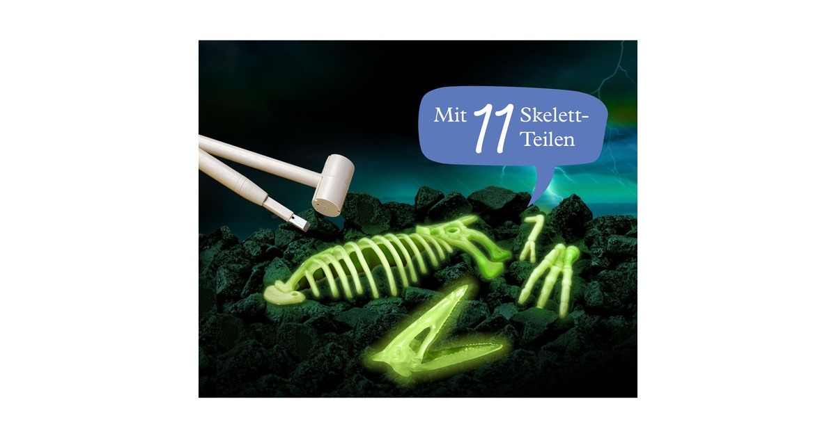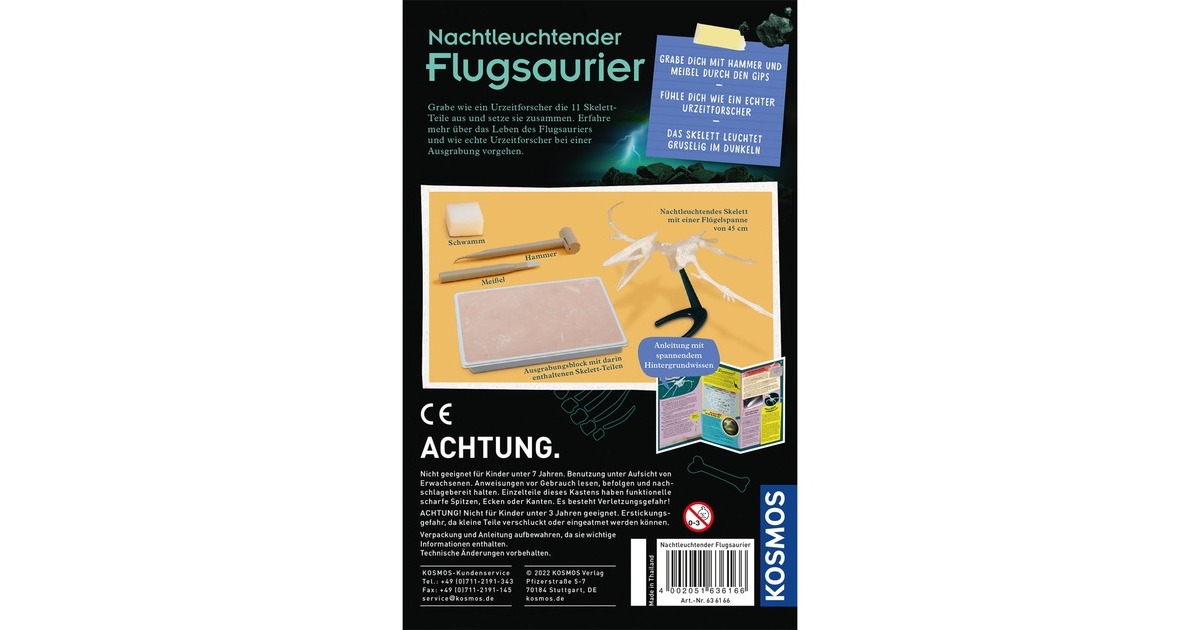 Urzeit-Forscher aufgepasst! In dem KOSMOS Experimentierset steckt das Skelett eines Flugsauriers und wartet darauf, ausgegraben zu werden! Mit dem passenden Werkzeug aus Hammer und Meißel legen Kinder zwischen 7 und 9 Jahren die Knochen vorsichtig frei – fast wie echte PaläontologInnen. Alle Knochen gefunden? Jetzt wird der Dinosaurier zusammengesetzt. Und er hat einen spannenden Trick auf Lager: Seine Knochen leuchten im Dunkeln! Mit der Flügel-Spannweite von 45 cm sieht er nicht nur bei Nacht beeindruckend aus. Auf dem mitgelieferten Podest kommt das Skelett besonders gut zur Geltung und ist eine tolle Deko für das Kinderzimmer!Art.-Nr.: 1877993