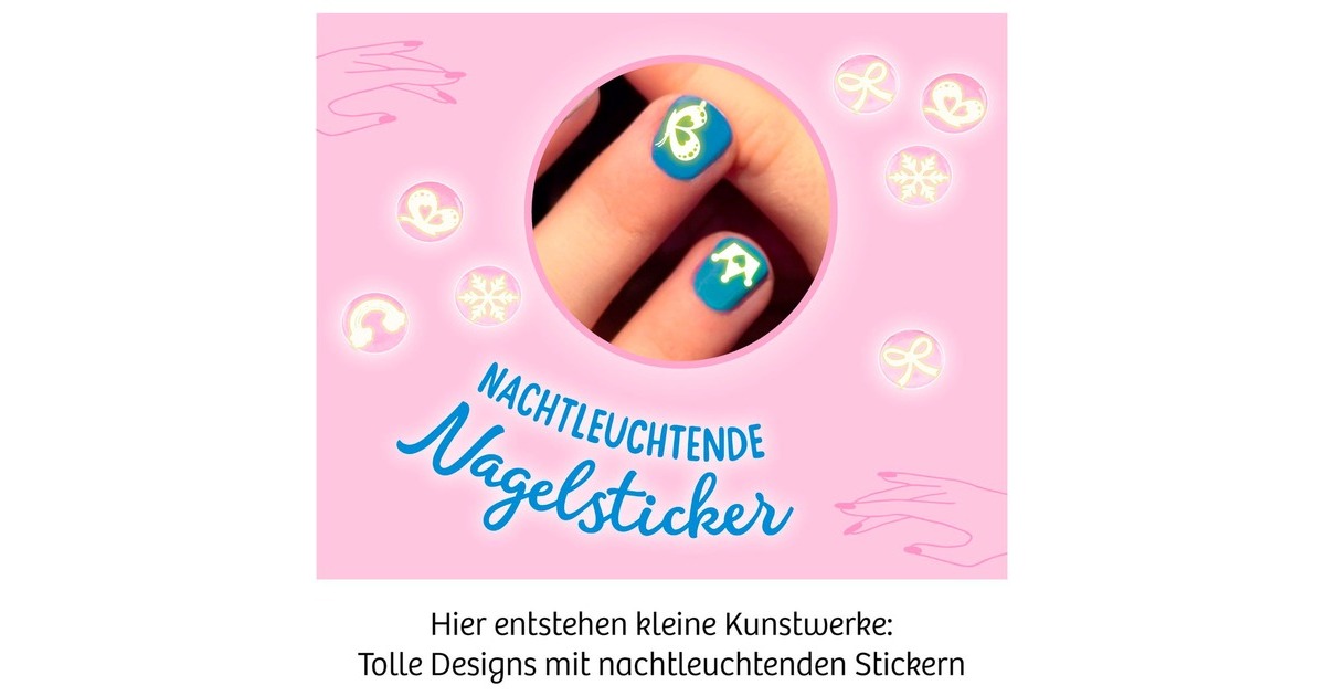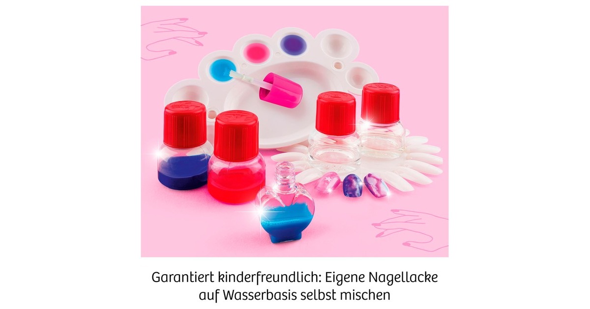 Die Fingernägel glänzen in rosa und blau – mit dem eigenen, individuellen Nagellack! Der wird mit diesem Set ganz einfach selbst hergestellt. Mit der Mischpallette werden aus zwei Basisfarben ganz individuelle Kombinationen erstellt und das schönste Ergebnis kann in einem herzförmigen Flakon aufbewahrt werden. Die enthaltenen Lacke bestehen alle auf Wasserbasis, womit sie immer angenehm riechen und leicht zu entfernen sind. Wie bei den Profis können kreative Muster erst auf dem ebenfalls enthaltenen Nagelrondell geübt werden. Oder doch lieber die Zehennägel verschönern? Mit dem praktischen Zehenspreizer kein Problem. Zu echten Hinguckern werden die Nägel spätestens mit im Dunkeln leuchtenden Nagel-Stickern.Art.-Nr.: 1848329
