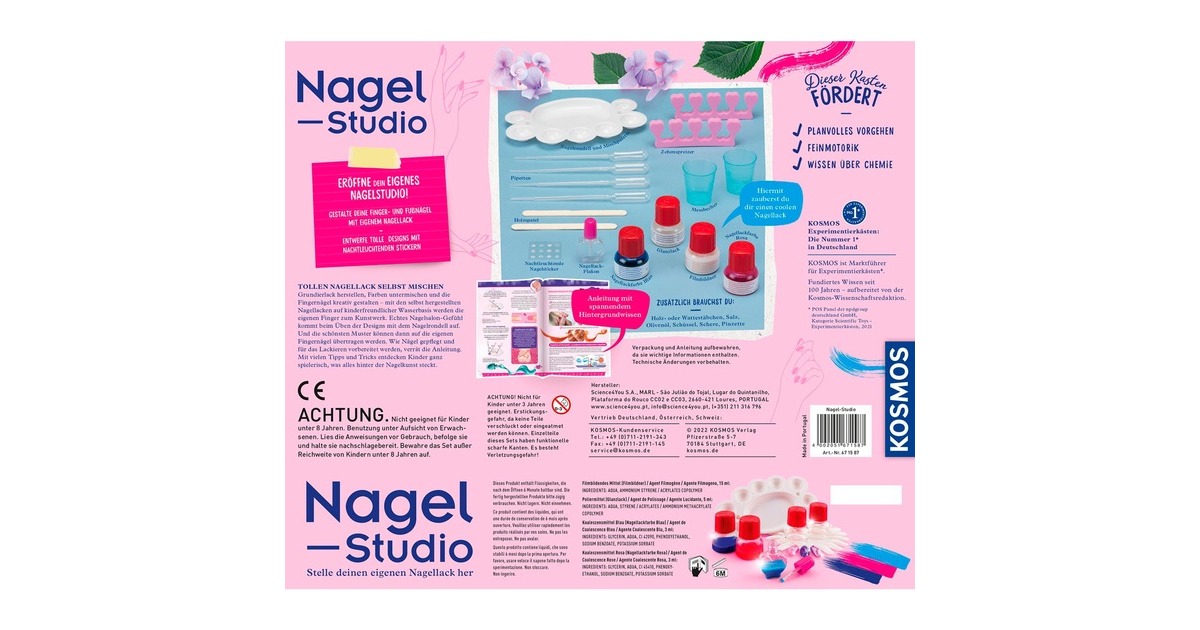 Inhaltsstoffe der in diesem Produkt enthaltenen Flüssigkeiten: Filmbildendes Mittel (Filmbildner), 15 ml Aqua, Ammonium Styrene/ Acrylates Copolymer. Poliermittel (Glanzlack), 5 ml: Wasser, Styrene, Acrylates, Ammonium Methacrylate Copolymer. Koaleszensmittel Blau (Nagellackfarbe Blau), 3 ml: Glycerin, Wasser, CI 42090, Phenoxyethanol, Sodium Benzoate, Potassium Sorbate. Koaleszensmittel Rosa (Nagellackfarbe Rosa), 3 ml: Glycerin, Wasser CI 45410, Phenoxyethanol, Sodium Benzoate, Potassium Sorbate. |