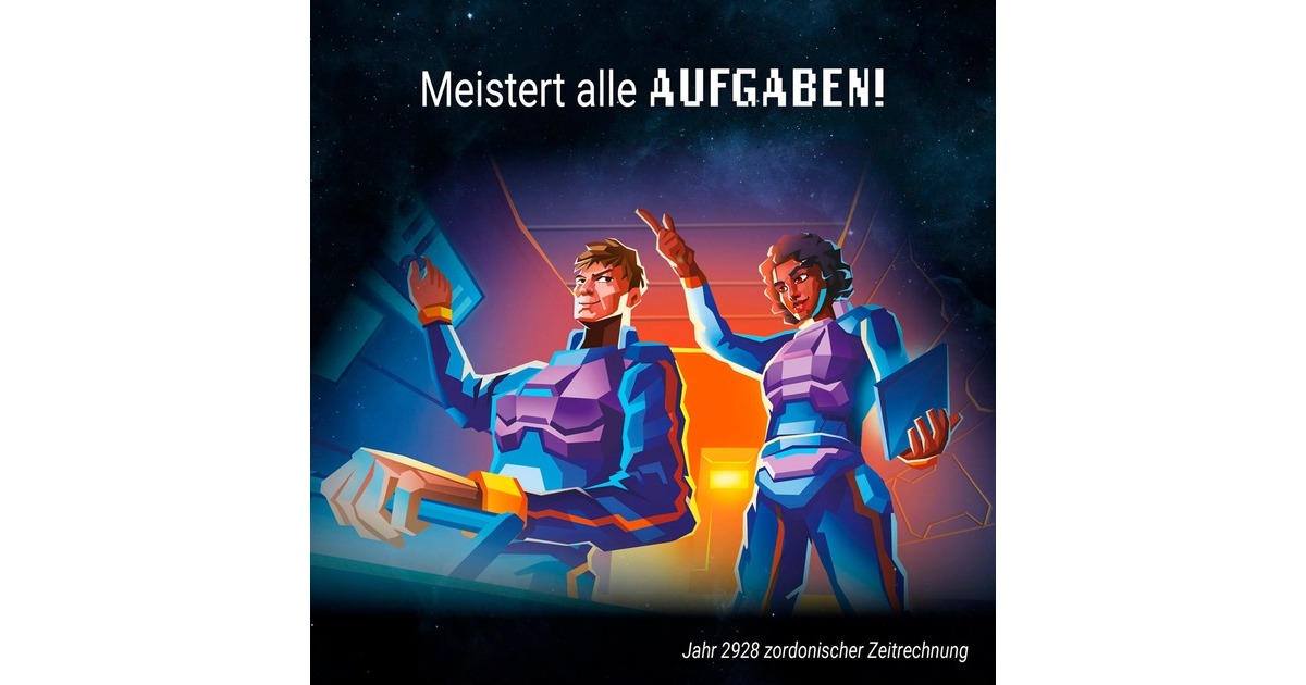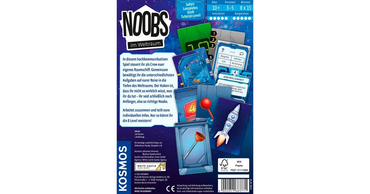 Auf ins Abenteuer im Weltraum: Eine Gruppe unerfahrener Astronauten steuert ein Raumschiff. Doch wie geht das überhaupt? Nur gemeinsam kriegen es die zwei bis fünf Spielerinnen und Spieler ab 10 Jahren hin. Dazu müssen sie eine Aufgabe nach der anderen lösen und sich gut abstimmen. Jedes Teammitglied kennt dabei nur einen Teil der Lösung. Mehrere Level mit neuen Herausforderungen liegen vor ihnen. Dieses Kartenspiel ist kooperativ, mit Zeitdruck und abwechslungsreich – ein actionreiches Eventspiel für jeden Spieleabend.