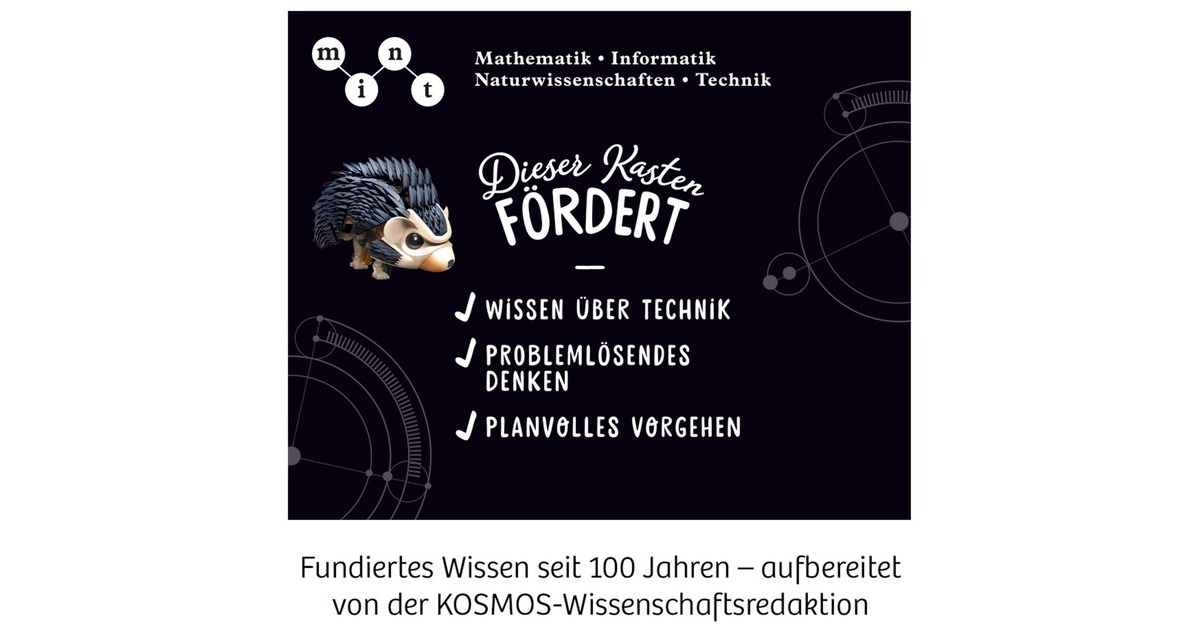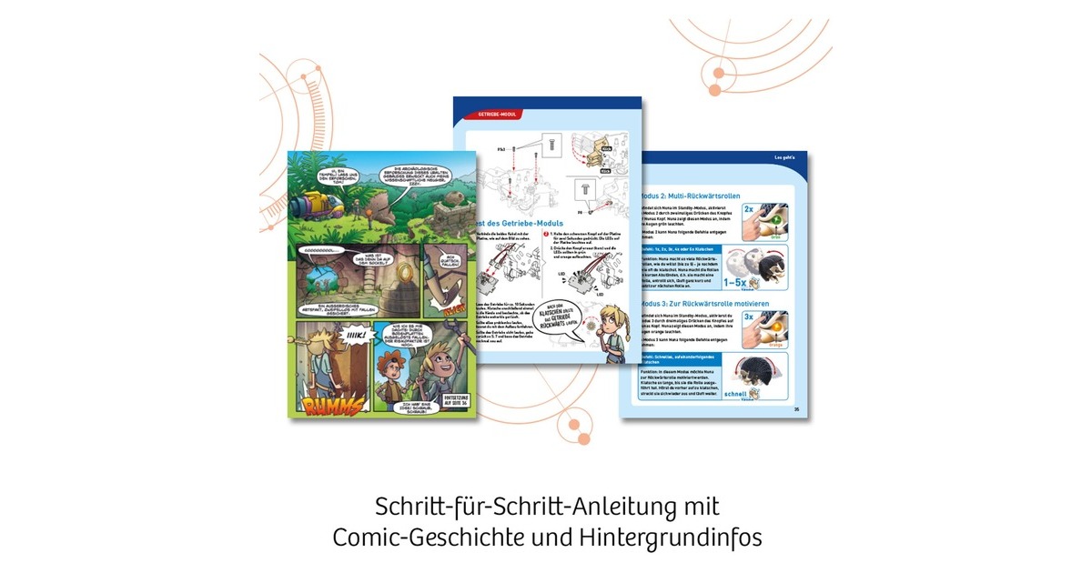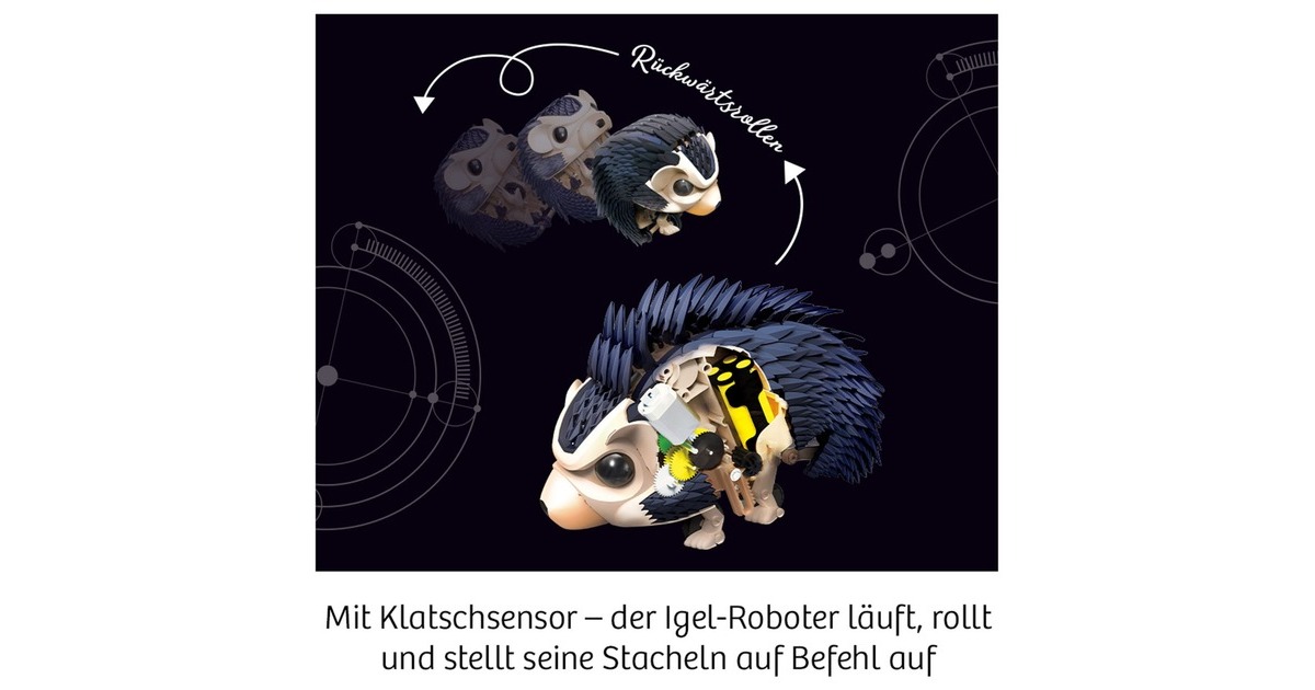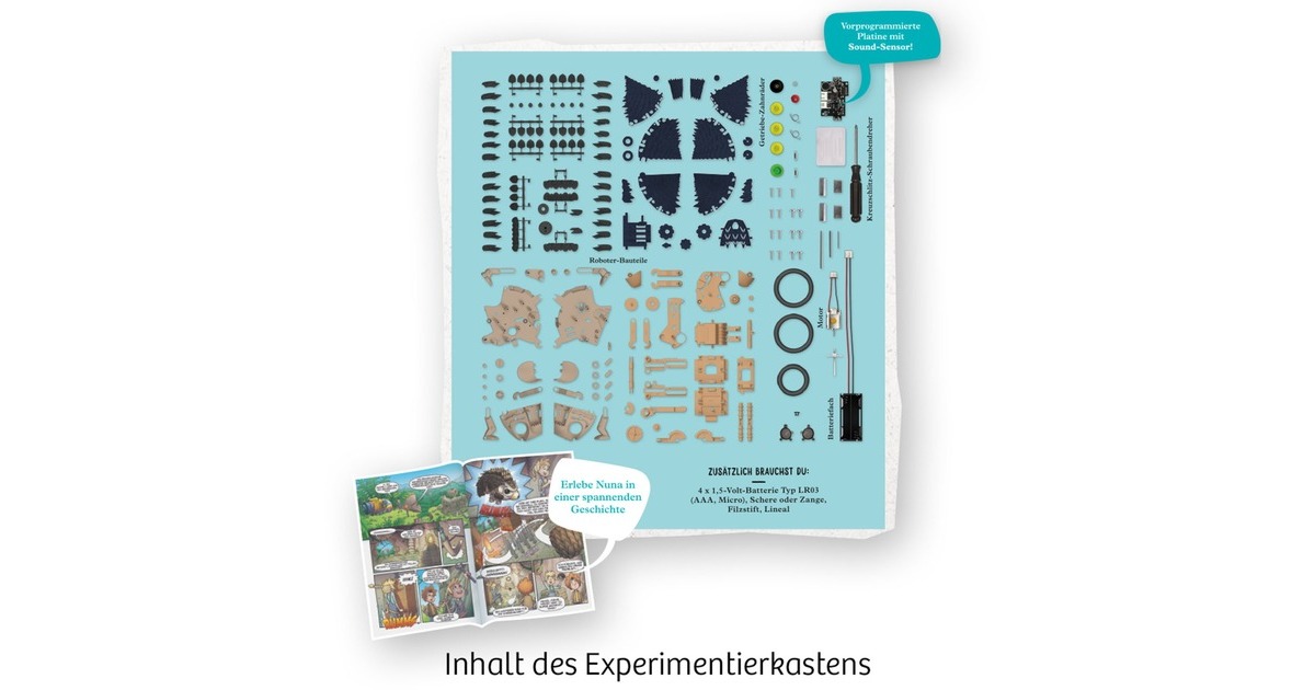 Ein schlauer Igel-Roboter, der auf Klatschbefehle reagiert – das ist Nuna aus der Roboterfamilie von KOSMOS. Mit dem Experimentierkasten konstruieren Kinder ab 8 Jahren einen Roboter, der es in sich hat. Dank des Sound-Sensors weiß der Igel genau, welche Bewegungen er ausführen soll. Er läuft, stellt die Stacheln auf und rollt sogar rückwärts! Die leuchtenden LED-Augen verraten, in welchem Modus sich der Igel-Roboter gerade befindet. Stecken, klicken, schrauben – das Zusammenfügen der 170 Einzelteile aus dem hochwertigen Bausatz fördert die Feinmotorik und planvolles Vorgehen und bietet viel Bauspaß. Die Anleitung zeigt detailliert und Schritt für Schritt, wie es geht. Mit einer Comic-Geschichte tauchen die Kinder in die Welt von Nuna, Izzy und Tom ein und erfahren spannendes rund um Roboter und ihre Mechanik.Art.-Nr.: 1560503