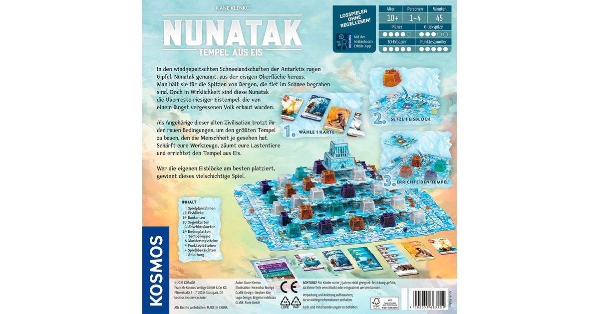 Ein Nunatak ist ein aus dem Eis herausragender Felsen oder Berggipfel. Doch stimmt das wirklich? Was ist, wenn es sich nicht um einen Berg, sondern um die Spitze eines vorgeschichtlichen Tempels im ewigen Eis handelt? Einen solchen Tempel, der aus von Menschenhand gehauenem Eis besteht, errichten die ein bis vier Spielerinnen und Spieler in diesem dreidimensionalen Spiel. Spielstein für Spielstein entsteht der Tempel mit coolen 3D-Spielsteinen in Eis-Optik. Gemeinsam den Tempel bauen, aber gegeneinander spielen: Am Ende geht es darum, die meisten Punkte zu gewinnen. Das Spiel enthält auch eine Solo-Variante.