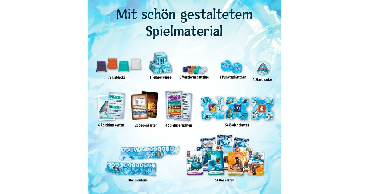 1 Spielplanrahmen, 72 Eisblöcke, 54 Baukarten, 20 Segenkarten, 6 Abschlusskarten, 54 Bodenplatten, 1 Tempelabschluss, 8 Spielsteine, 4 Punkteplättchen, 4 Spielübersichten, 1 Anleitung |