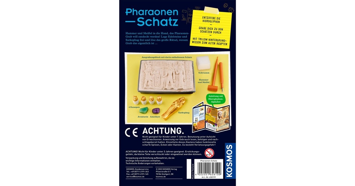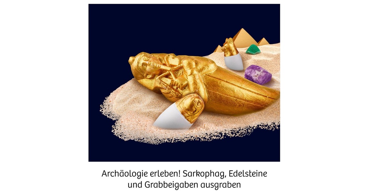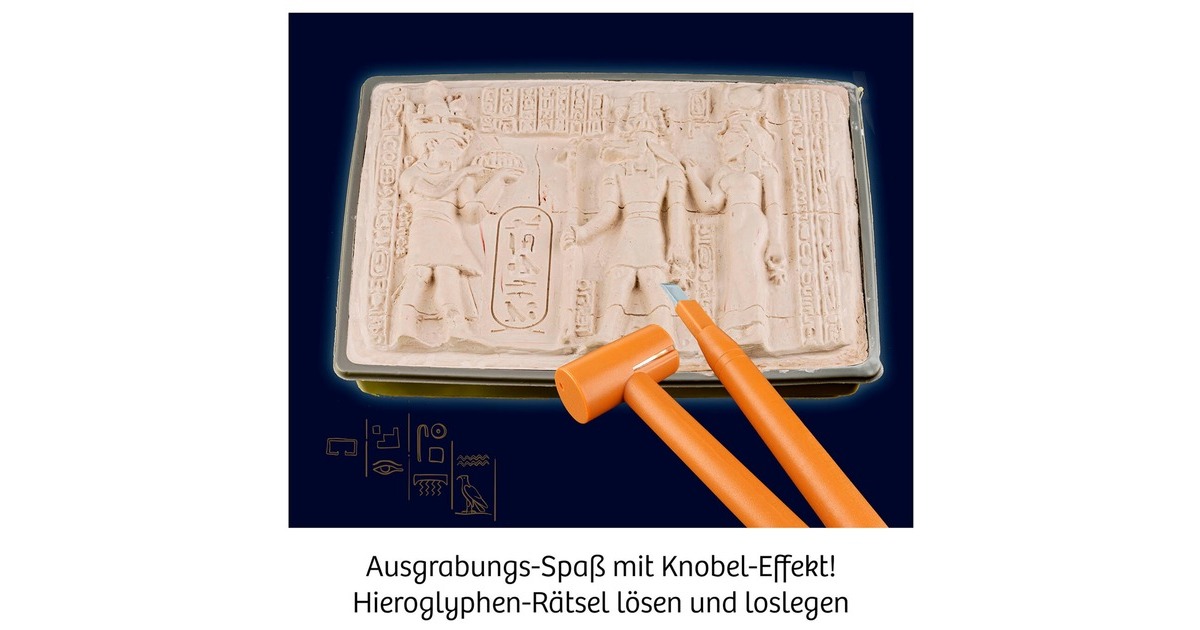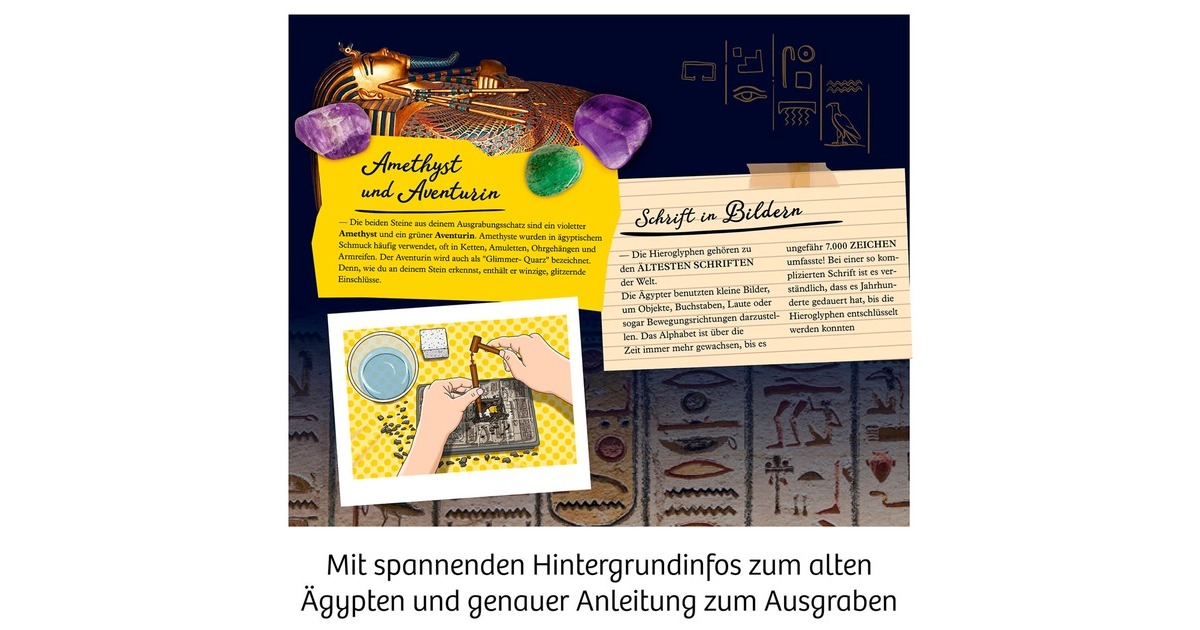 Der sandige Wüstenwind hat den Schatz des Pharaos im Laufe der Jahrtausende tief unter sich vergraben. Nun sind Archäölogen gefragt, die die versunkenen Schätze sichern. Mit diesem Ausgrabungs-Set geht es auf Reisen in ein weit entferntes Land. Doch was bedeuten die Zeichen auf dem Gipsblock? Mit dem Hieroglyphen-Alphabet in der farbig illustrierten Anleitung erschließt sich das große Rätsel, wessen Grabstätte gerade entdeckt wird. Schicht für Schicht werden die Grabbeigaben freigelegt: Edelsteine, Kanopen mit tierischen Köpfen und sogar ein glänzender Sarkophag. Die Anleitung hilft dabei Schritt für Schritt und enthält spannende Informationen zur Hochkultur des alten Ägypten. Art.-Nr.: 1904779
