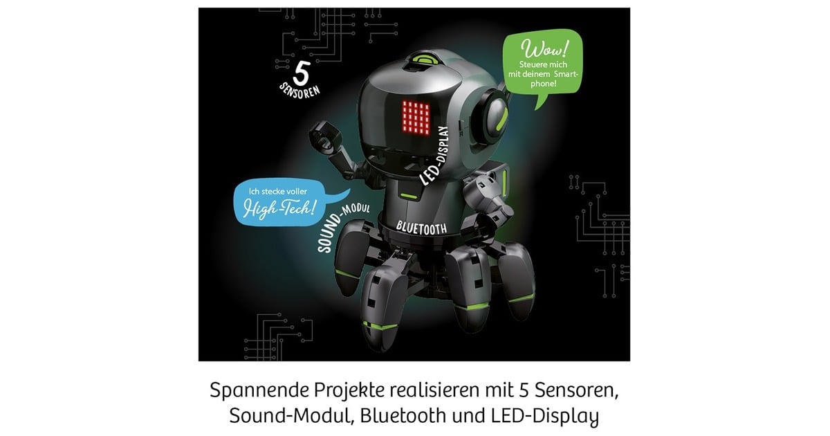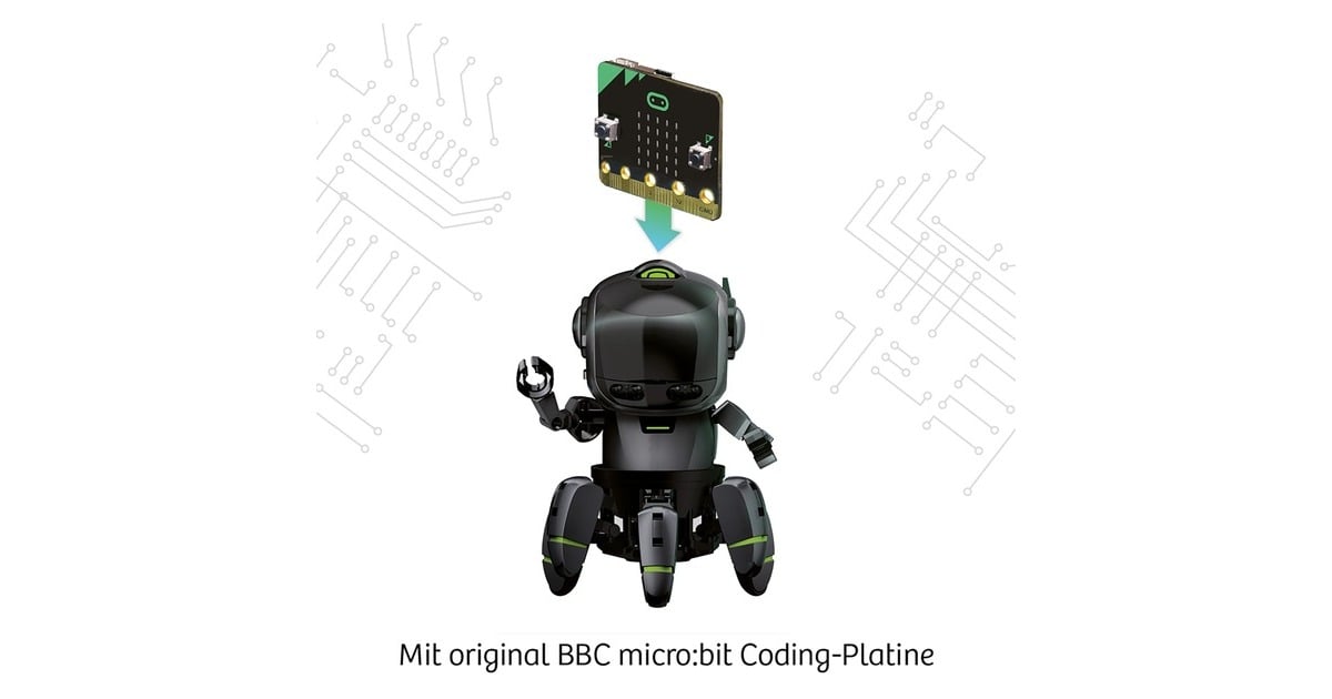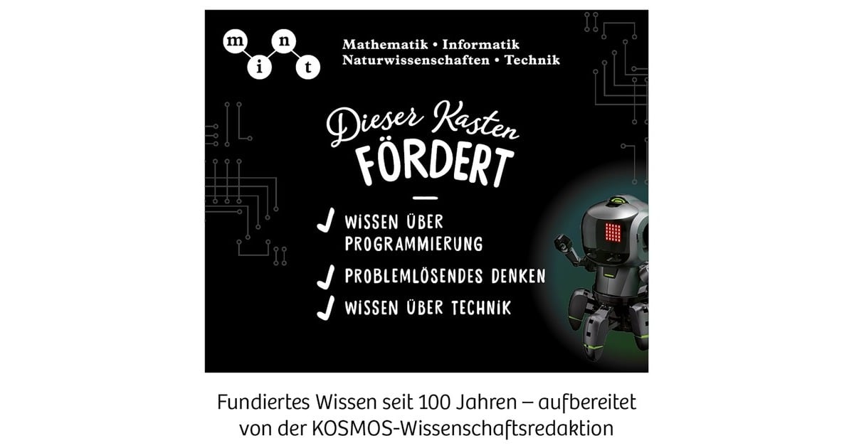 Ein Roboter der zum Beispiel „Schere, Stein, Papier“ spielt, rechnen kann, zum Kompass oder digitalen Würfel wird, die Temperatur misst, per App ferngesteuert werden kann – das ist Proxi. Der Aufbau von Proxi ist Bestandteil des Experimentierkastens und natürlich zeigt die Anleitung Schritt für Schritt, was zu tun ist und gibt Hinweise, worauf beim Zusammenbau zu achten ist. Das fördert die Feinmotorik und gibt einen tollen Einblick ins Innenleben des Roboters. Auf diese Weise können Kinder die Funktionsweise von Proxi sehr gut nachvollziehen. Ist Proxi einmal aufgebaut, kommt die micro:bit-Platine ins Spiel. KOSMOS bietet Programmieranfängern fertige Codes zum Download an, damit direkt mit Proxi losgespielt werden kann. Kinder müssen dafür nur den micro:bit mit dem mitgelieferten USB-Kabel an einen Computer anstecken und den heruntergeladenen Code per „drag and drop“ auf die Platine ziehen. Anschließend wird der micro:bit einfach in Proxis Kopf eingesteckt und der Spaß kann beginnen: Er singt und tanzt, wird zur Bowlingkugel oder zeigt kleine Notizen in seinem Display an. Selbstverständlich können Kinder die micro:bit-Platine auch selbst programmieren. Wie das geht, erklärt die Anleitung kindgerecht und anhand eines anschaulichen Beispiels. Die micro:bit Platine wird mithilfe einer grafischen, blockbasierten Programmiersprache programmiert (MakeCode). Kinder können die bestehenden Codes modifizieren oder ganz eigene Programme schreiben. Und natürlich steht ihnen das gesamte Wissen und alle Projekte der riesigen micro:bit-Community offen. Zugang zum Programmier-Editor und zu Community-Projekten erhalten Nutzer über die Seite microbit.org die von der Micro:bit Educational Foundation betrieben wird, einer non-profit-Organisation deren Ziel es ist, Kindern den Zugang zu Bildung im Bereich der IT zu ermöglichen. Proxi ist ein von der Microbit-Stiftung anerkanntes micro:bit-Zubehör-Set.Art.-Nr.: 1618858