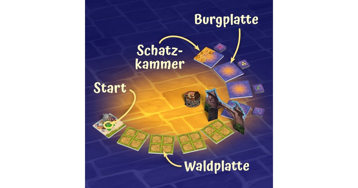 1 Raffi-Raffzahn-Figur, 9 Wegplatten, 1 Schatzkammer, 1 Burgtor, 16 Juwelenkärtchen, 16 Truhen-Teile, 1 Spielanleitung |