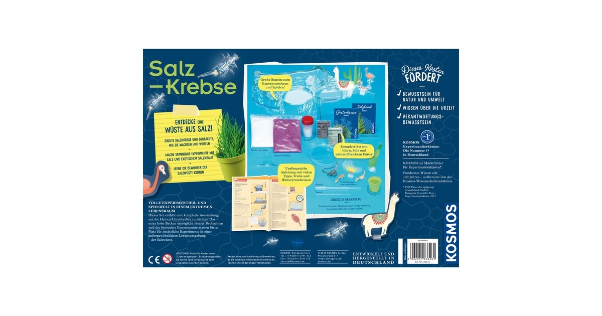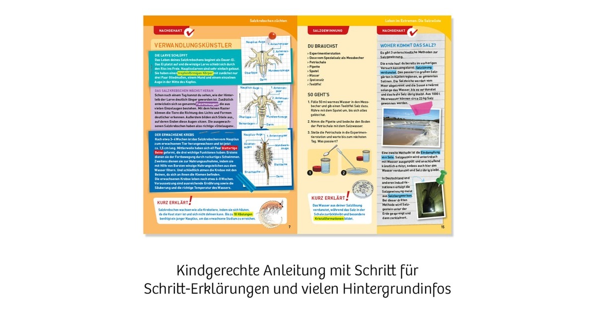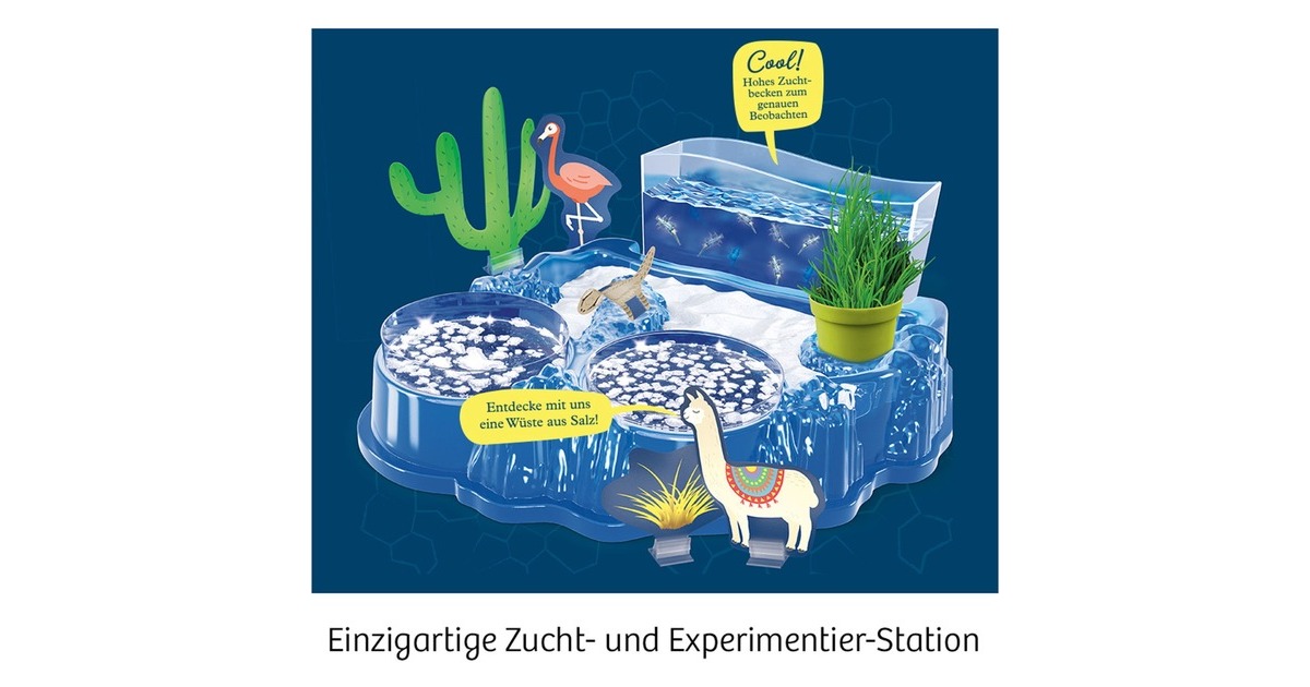 Und sie leben wirklich! Hier dreht sich alles um die Aufzucht von Urzeitkrebsen und deren Beobachtung in der Salzwüsten-Experimentierstation. Denn wer in dem hohen Zuchtbecken aus Spritzguss genau hinschaut, schult seinen Blick für die kleinen Krebse, die nach nur einem Tag aus den Eiern schlüpfen. Damit nicht genug - in Petrischalen und Pflanztöpfchen können die kleinen und großen Forscher Salzkristalle, Salzkraut und Kresse selbst züchten. Natürlich befindet sich neben einem Spatel und einer Pipette auch eine Lupe in der Box für weitere Experimente, die als Anregung in der ausführlichen Anleitung beschrieben werden. Zusätzlich wird ein außergewöhnlicher Lebensraum, die Salzwüste und deren Bewohner, kennengelernt. Für Spielspaß sorgen auch die bunten 3D-Folienfiguren und der pinke und weiße Sand. Krebse-Füttern nicht vergessen!Art.-Nr.: 1524719