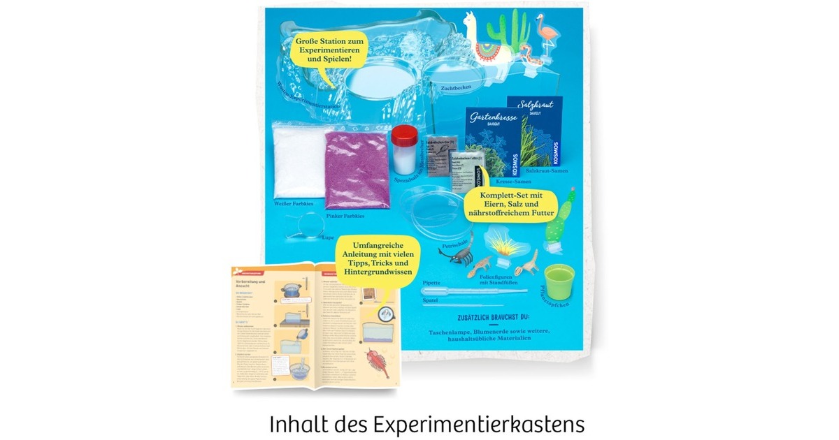 Salzwüsten-Experimentierstation, Zuchtbecken, 3D-Folienfiguren, Standfüße, Spezialsalz im Messbecher, Salzkrebscheneier, Salzkrebschenfutter, Aquariensand pink und weiß, Pipette, Spatel, Lupe, Petrischale, Pflanztöpfchen, Kresse-Samen, Salzkraut-Samen, farbig illustriertes A5-Anleitungsheft |