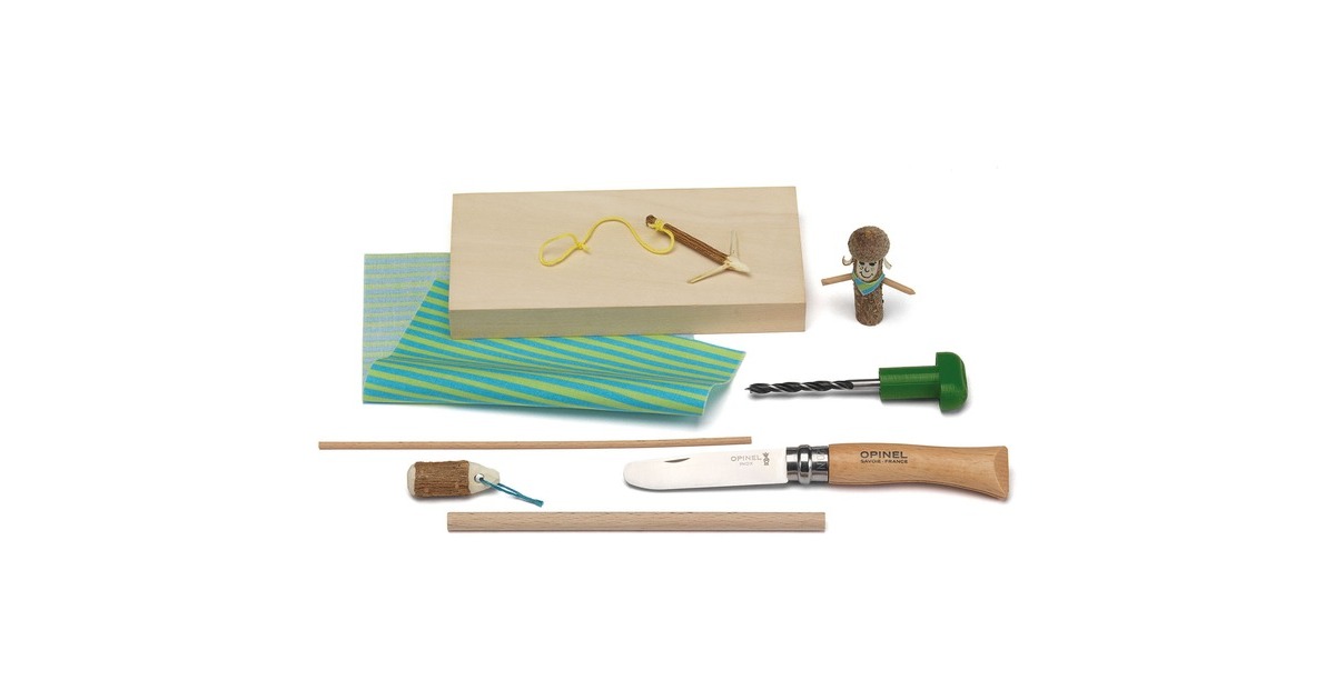 Opinel-Kinderschnitzmesser, Holzbohrer, Griff für Holzbohrer, Lindenholz-Block, runder Holzstab, Holzstäbchen, Stoffzuschnitt, Bündel Stickgarn, Sticknadel, Anleitung (32 S.) |