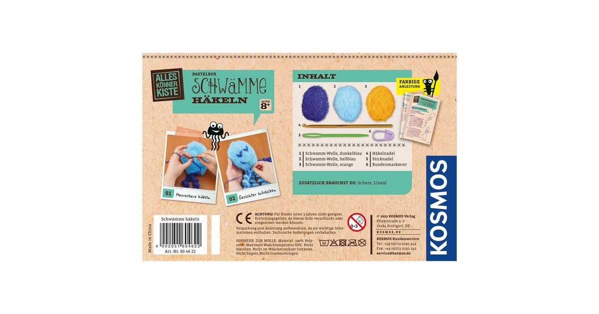 Badespaß mit selbst gemachten Schwämmen! Oktopus, Wal und Co. werden einfach aus der besonderen Schwamm-Wolle gehäkelt und direkt mit unter die Dusche genommen. Die ausführliche Anleitung leitet Kinder ab 8 Jahren mit vielen Bildern durch die einzelnen Häkel-Schritte, sodass die witzigen Meerestiere Masche für Masche gelingen. Der praktische Rundenmarker unterstützt Häkel-Anfänger und Fortgeschrittene. Neben den Grundtechniken des Häkelns verrät die Anleitung außerdem, wie lustige Gesichter gestaltet werden können. Einen Aufhänger häkeln, damit die Schwämme als tolle Deko im Bad hängen? Kein Problem! Jeder Badeschwamm kommt auch als Waschlappen zum Einsatz und ist bei 60 Grad waschbar!Art.-Nr.: 1877965