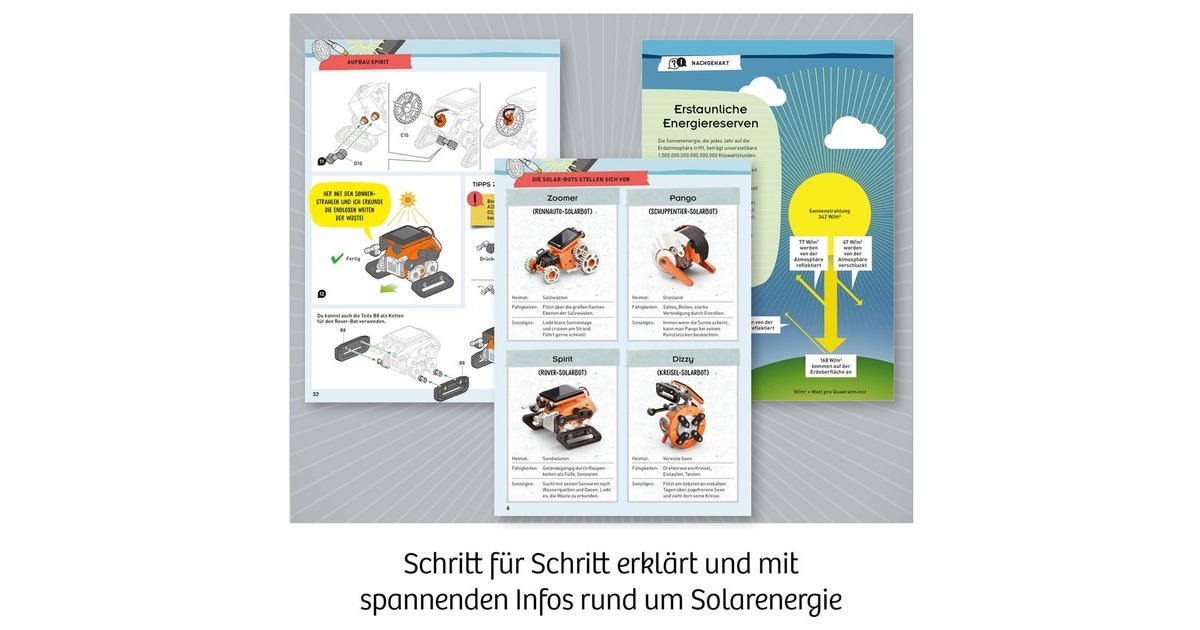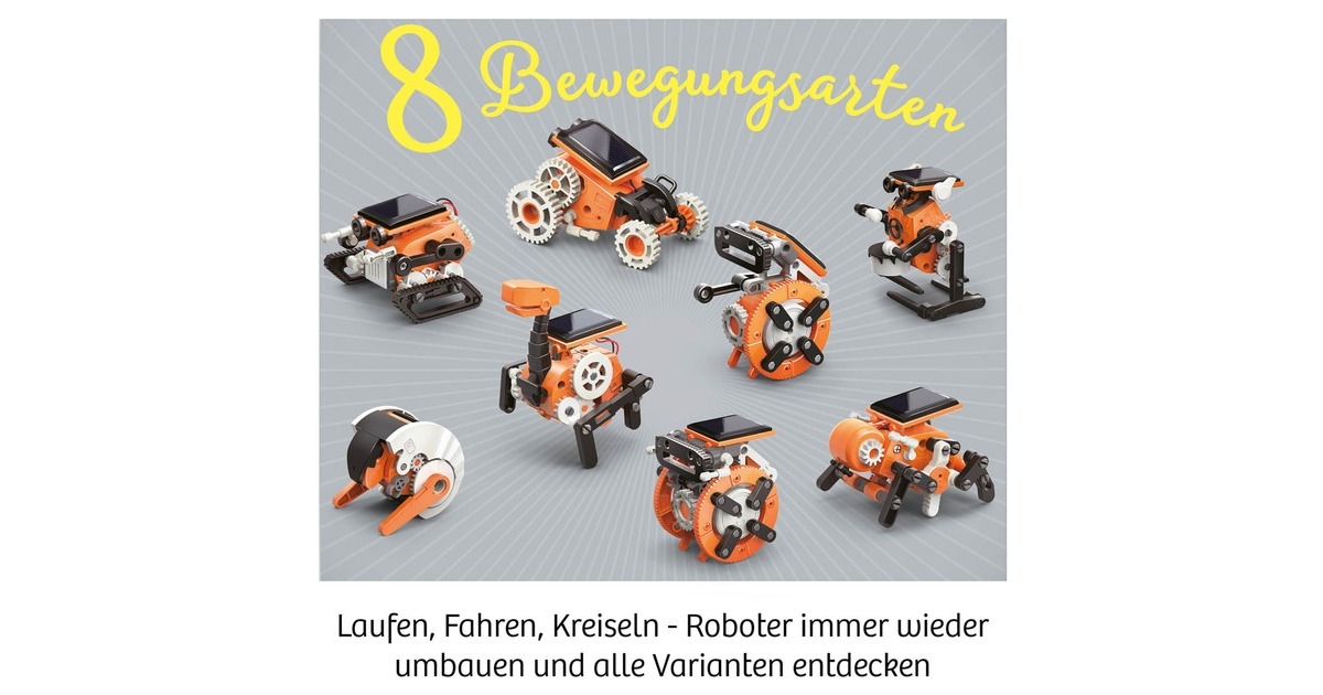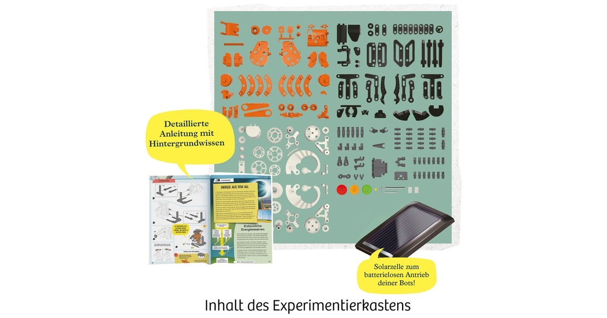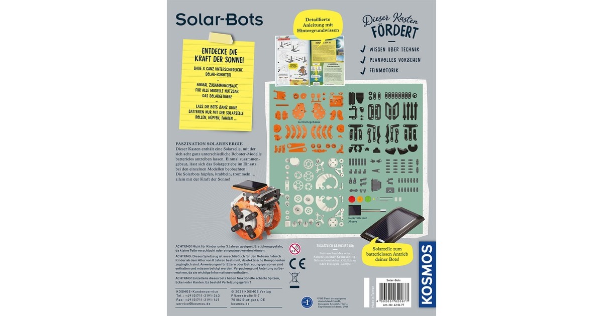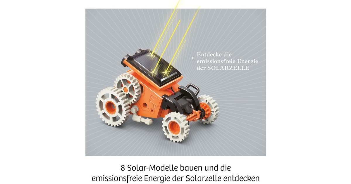 Achtung! Hier kommen kleine Energiebündel, die durch die Kraft der Sonne kreiseln, springen, fahren und krabbeln können. Ein Solargetriebe als Basis wird mit Hilfe eines vielseitigen Bau-Sets zu 8 verschiedenen Solar-Bots umgebaut. Immer wieder kann der kleine Roboter seine Form verändern: Käfer, Rennauto, Dino und fünf andere Charaktere warten auf ihr Erwachen. Tipp: Wer eine Halogenlampe oder Glühbirne zur Hand hat, der kann seine kleinen Roboter bei schlechtem Wetter auch im Kinderzimmer ausprobieren! Doch wie funktioniert eigentlich eine Solarzelle? Und was sind erneuerbare Energien? Dies und weitere spannende Infos finden sich in der bebilderten Schritt-für-Schritt-Anleitung. Dieser Experimentierkasten von KOSMOS ist ein pfiffiges Geschenk für Kinder von 8 bis 12 Jahren mit langanhaltendem Spielspaß und erstem Wissen aus Physik und Technik.Art.-Nr.: 1732691