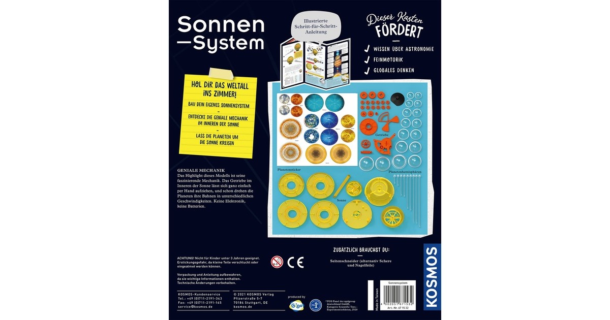 Das ganze Sonnensystem im eigenen Kinderzimmer! Dieses geniale Modell wird aus über 50 Teilen ganz einfach zusammengesteckt. Herzstück und Antrieb des Ganzen ist die Sonne – in ihr wird die Mechanik eingebaut, die die Planeten in vier Geschwindigkeiten und acht unterschiedlichen Umlaufbahnen zum Kreisen bringt. Das Beste daran: Dafür wird noch nicht einmal eine Batterie benötigt. Das Getriebe in der Sonne ist nämlich ein Aufziehmotor – einfach Aufziehen, und schon wandern alle Planeten von Merkur bis Neptun in unterschiedlicher Geschwindigkeit um das gelbe Zentrum. Mit einem Saugnapf kann das Sonnensystem auf verschiedenen Oberflächen befestigt werden. Astronomie hautnah und eine besondere Deko im Kinderzimmer! Ein KOSMOS Experimentierkasten für alle Kinder von 8 bis 12 Jahren, die Sternbeobachtung lieben oder von der Raumfahrt träumen.Art.-Nr.: 1732684
