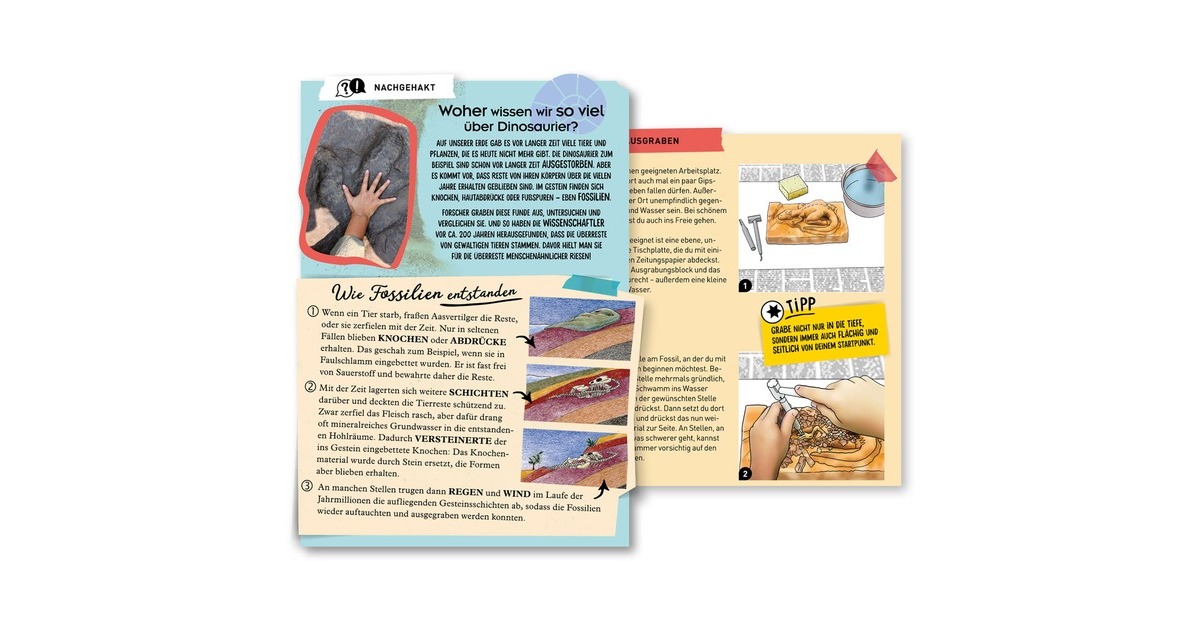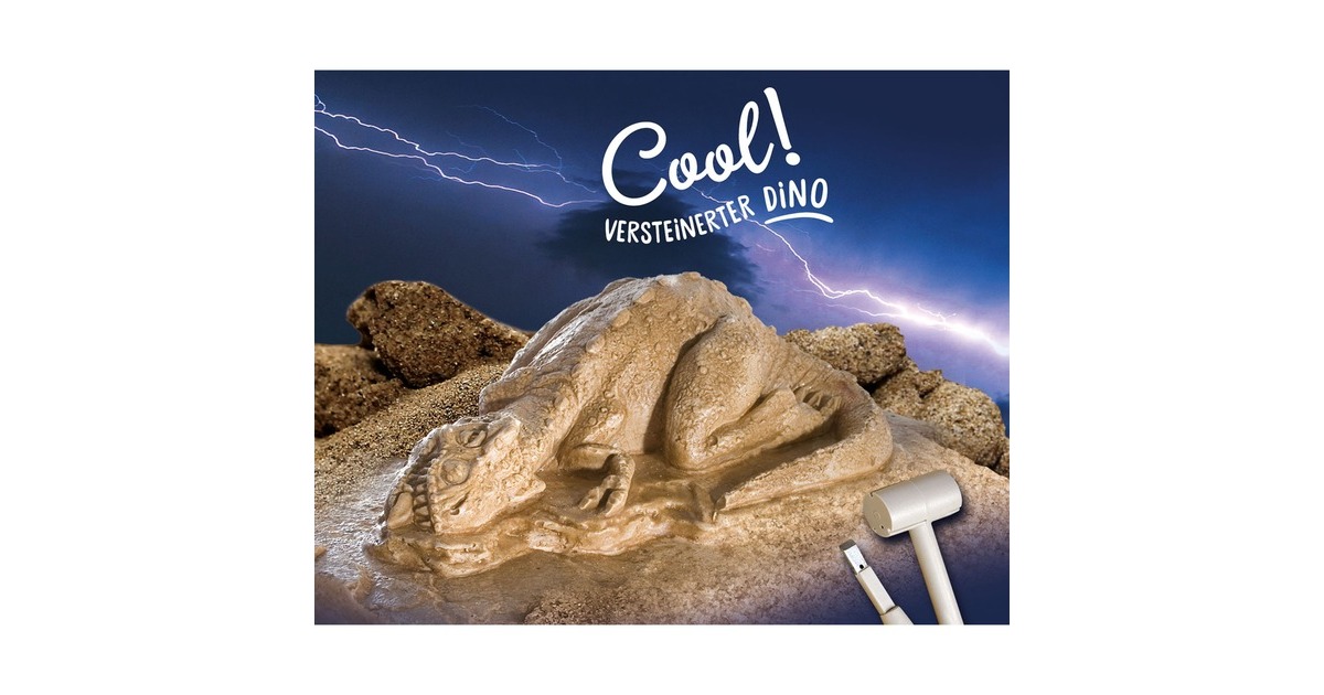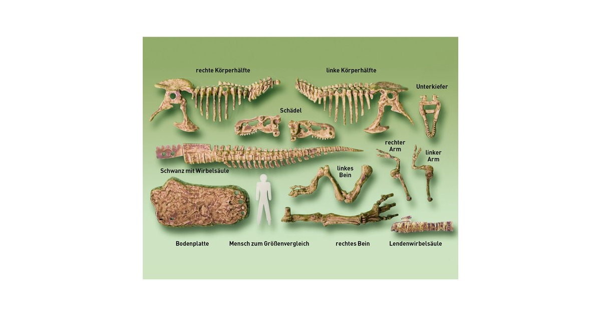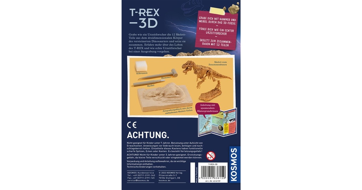 Auf ins Ausgrabungs-Abenteuer! Im Gestein verstreut liegen die Knochen eines Tyrannosauraus, die vorsichtig mit Hammer und Meißel freigelegt werden müssen. Echte Urzeit-Atmosphäre schafft die Gestaltung des Gips-Blocks, der die Form eines versteinerten 3D-T-Rex zeigt, als wäre er gerade erst gestorben! Sind die Knochen dieses Urzeit-Giganten erst einmal ausgegraben, bauen die Kinder zwischen 7 und 9 Jahren das Skelett zusammen und stellen es als tolle Deko in ihrem Zimmer auf. Wer genau hinsieht kann neben dem Skelett sogar das Modell eines Menschen erkennen, zum Größenvergleich! Mit dem KOSMOS Ausgrabungs-Set erleben Kinder Dinosaurier im eigenen Kinderzimmer!