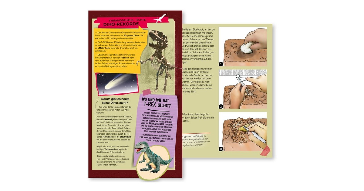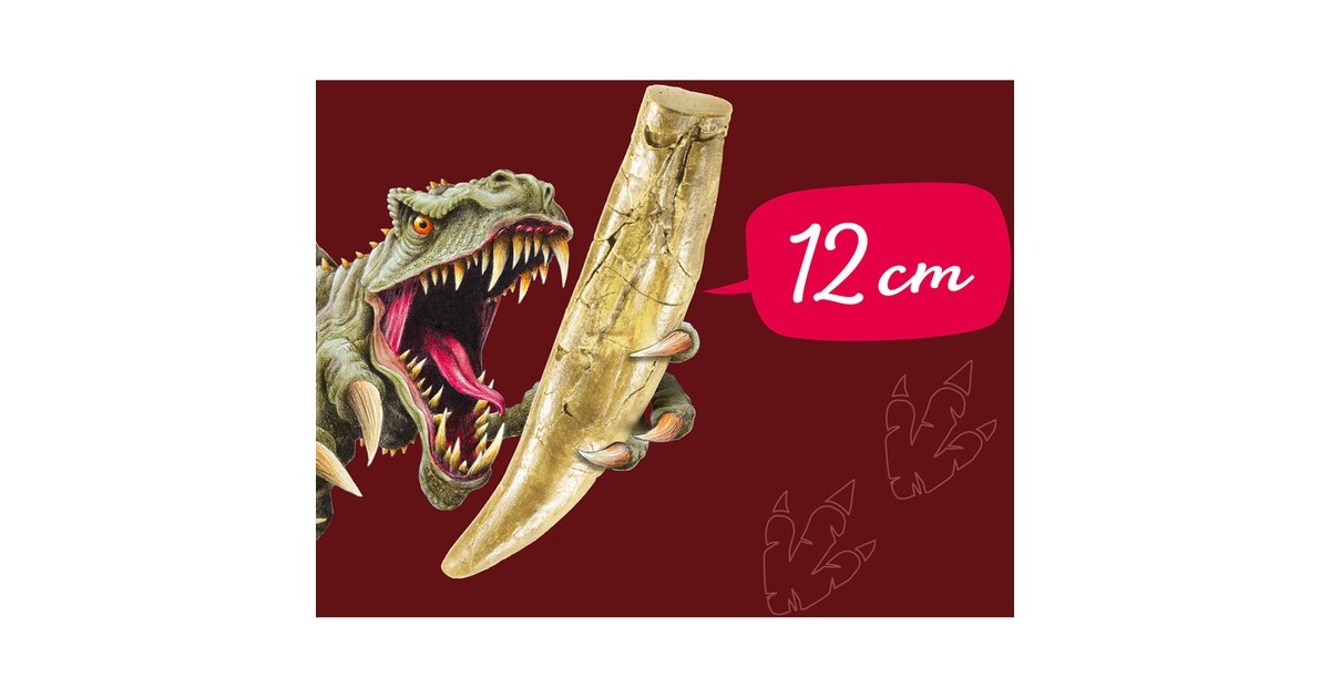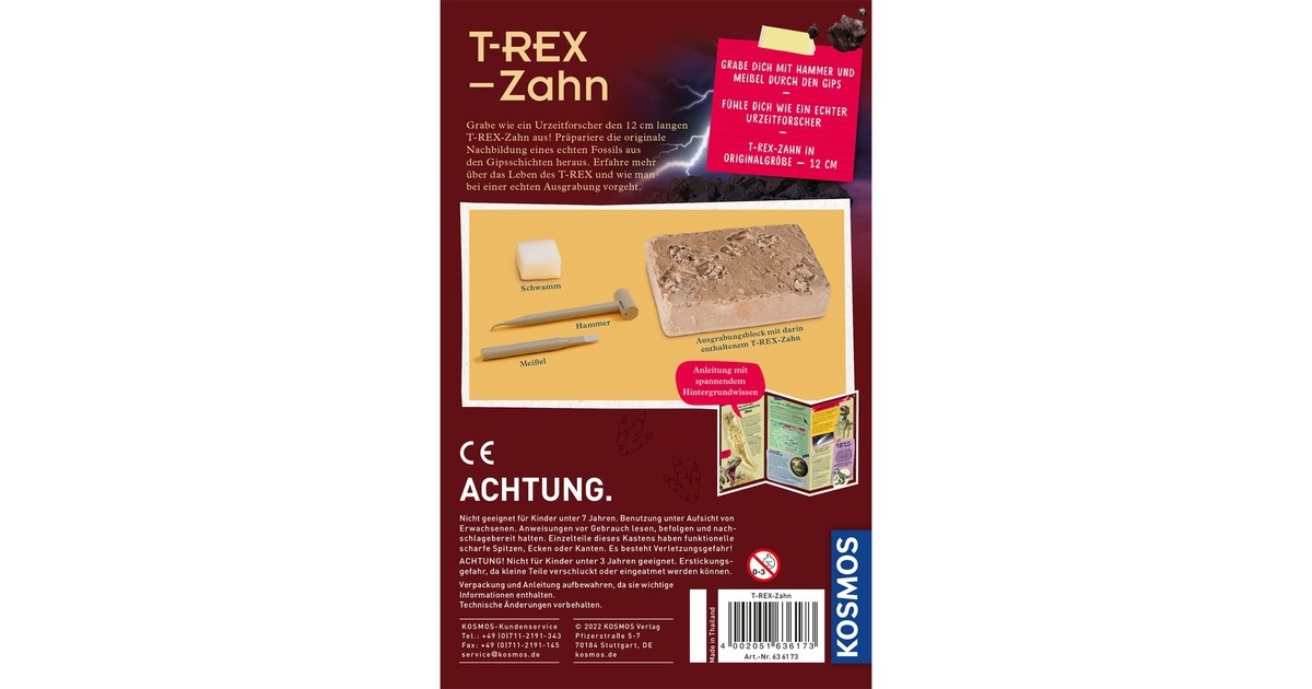 Ein T-Rex Zahn in Originalgröße! Aber wo steckt er? Bevor die täuschend echt aussehende Nachbildung des Zahns bestaunt werden kann, graben Kinder zwischen 7 und 9 Jahren ihn zuerst aus dem Gipsblock aus. Dazu liegen Hammer und Meißel schon bereit! Wie in einer archäologischen Ausgrabungsstätte wird der Zahn Stück für Stück vorsichtig freilegt – dabei ist eine ruhige Hand gefragt. Die Anleitung des KOSMOS Experimentiersets erklärt, welche Grabe-Technik am besten funktioniert und hält spannende Hintergrundinfos rund um Dinosaurier bereit! Wie entstehen Fossilien? Wann lebten die Dinosaurier in der Urzeit? Und als Fundstück vom berühmtesten aller Urzeit-Giganten ist er ein ganz besonderer Hingucker im Kinderzimmer.