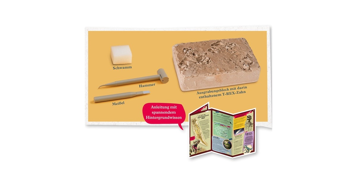 T-rex-Zahn in Originalgröße im Gipsblock, Hammer, Meißel, Schwamm |