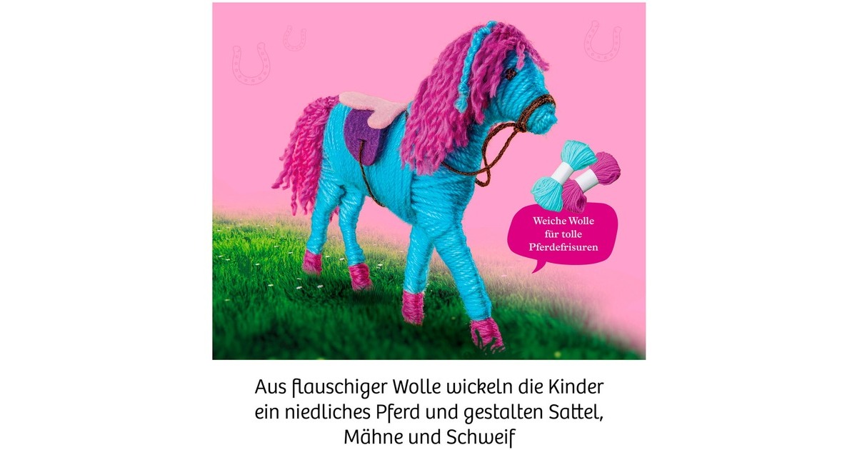Mit diesem Set entsteht mit Wickeltechnik ein buntes Pferd, dessen Aussehen ganz nach Belieben gestaltet werden kann. Einfach die türkifarbene und pinke Wolle um die Pferde-Form wickeln - für Mähne und Schweif kommt eine kindgerecht stumpfe Nadel zum Einsatz. Anschließend kann auch noch ein Mini-Sattel aus Filz gebastelt werden: Schon geht es los zum Ausritt im Kinderzimmer. Danach kann mit Perlen und Wollresten auch ein niedlicher Pferde-Anhänger gebastelt werden. Art.-Nr.: 1904780