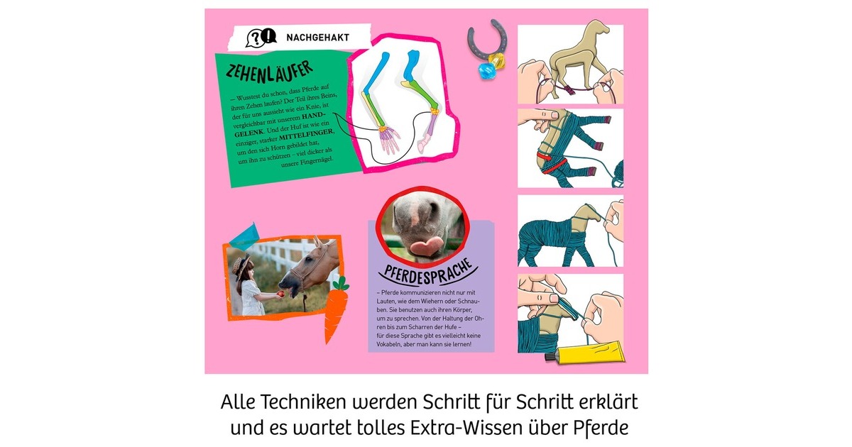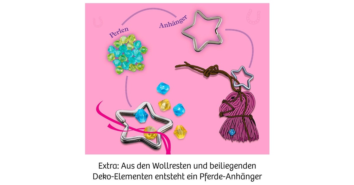 vorgestanzte Pappteile Pferd, Wolle (türkis und pink), Garn (braun), Filzteile für den Sattel, Perlen (blau und gelb), sternförmiger Schlüsselanhänger, stumpfe Nähnadel, Einfädler, farbig illustrierte Anleitung |