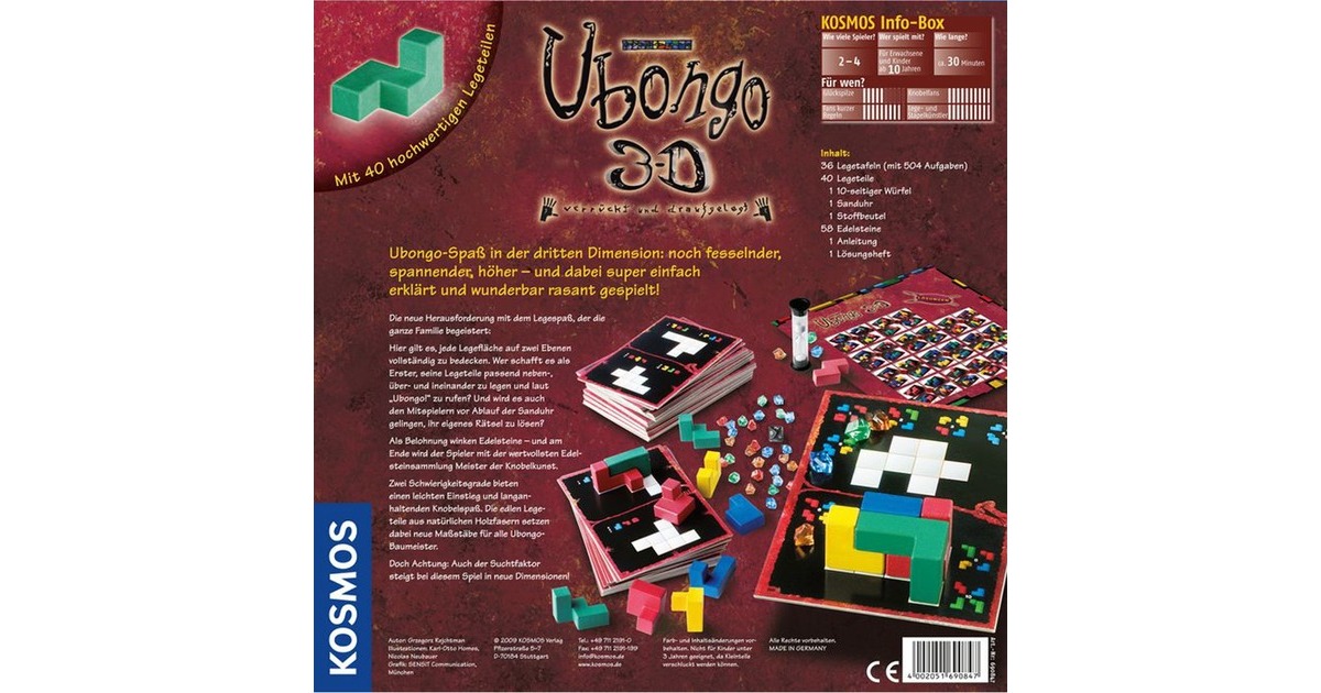 Ubongo-Spaß in der dritten Dimension: noch fesselnder, spannender, höher – und dabei super einfach erklärt und wunderbar rasant gespielt! Die neue Herausforderung mit dem Legespaß, der die ganze Familie begeistert: Hier gilt es, jede Legefläche auf zwei Ebenen vollständig zu bedecken. Wer schafft es als Erster, seine Legeteile passend neben-, über- und ineinander zu legen und laut „Ubongo!“ zu rufen? Und wird es auch den Mitspielern vor Ablauf der Sanduhr gelingen, ihr eigenes Rätsel zu lösen? Als Belohnung winken Edelsteine – und am Ende wird der Spieler mit der wertvollsten Edelsteinsammlung Meister der Knobelkunst. Zwei Schwierigkeitsgrade bieten einen leichten Einstieg und langanhaltenden Knobelspaß. Die edlen Legeteile aus natürlichen Holzfasern setzen dabei neue Maßstäbe für alle Ubongo-Baumeister. Doch Achtung: Auch der Suchtfaktor steigt bei diesem Spiel in neue Dimensionen! Art.-Nr.: 1187294