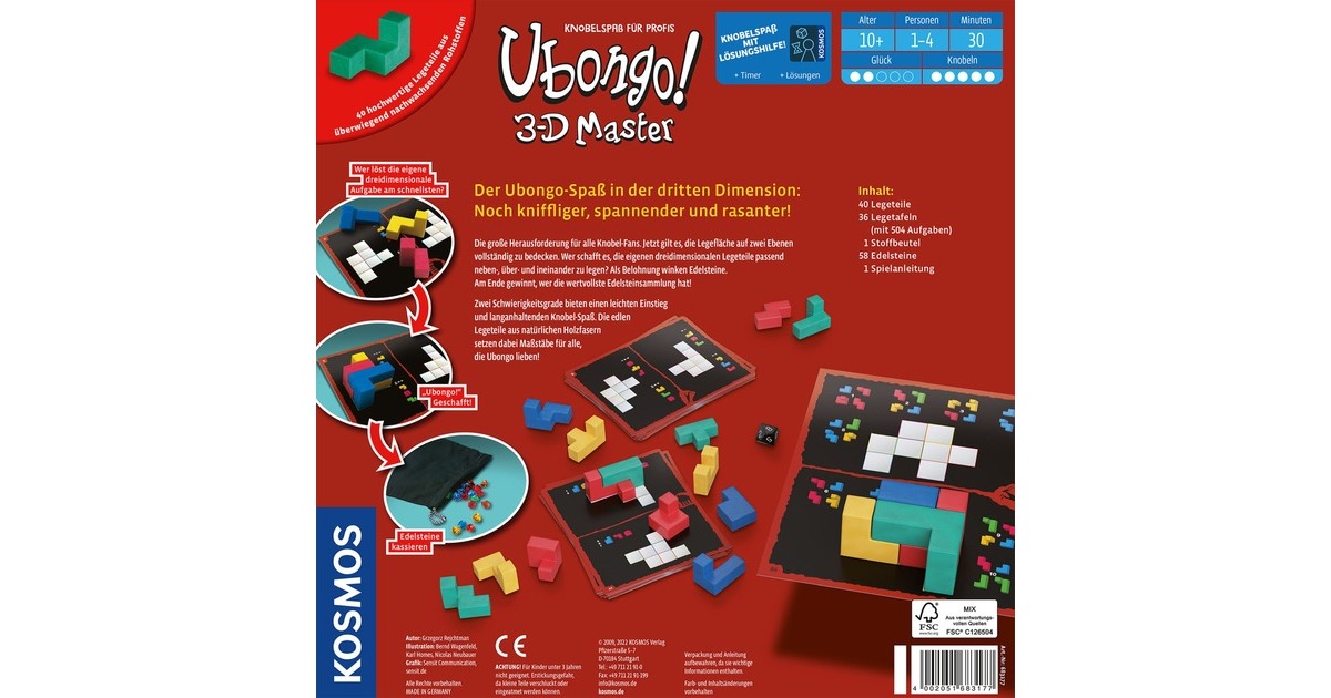 Mit 3-D Master geht Ubongo in die dritte Dimension: Nun muss jede Legefläche auf zwei Ebenen vollständig bedeckt werden. Doch sonst bleiben die Regeln gleich: Alle legen gleichzeitig möglichst schnell die ihnen gestellten Aufgaben nach. Wer zuerst fertig ist und "Ubongo" ruft, gewinnt einen Edelstein. Wer am Ende die meisten gesammelt hat, gewinnt dieses temporeiche Familienspiel mit hohem Spaß- und Suchtfaktor.Art.-Nr.: 1877584