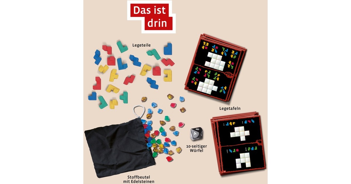 40 Legeteile, 36 Legetafeln mit 504 Aufgaben, Stoffbeutel mit Edelstein, Anleitung |