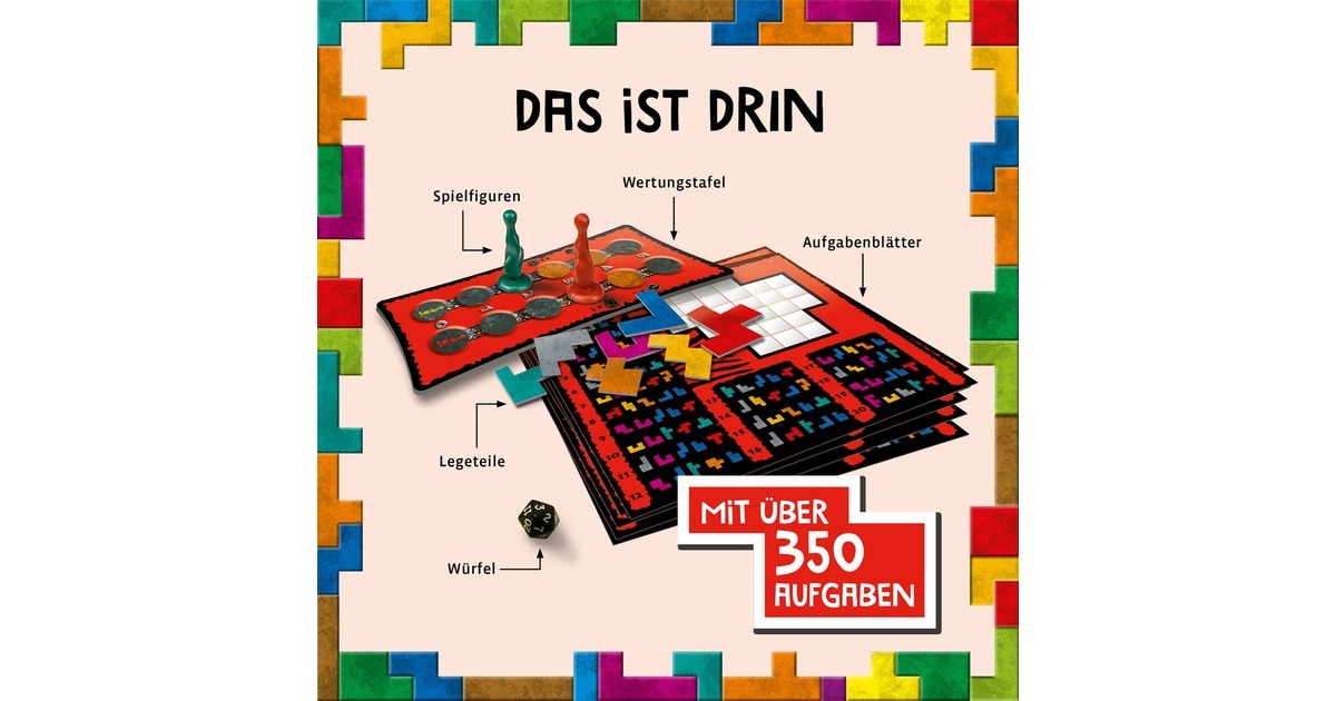 18 Aufgabenblätter, 42 Legeteile, 2 Spielfiguren, 1 Würfel, 1 Wertungstafel, 1 Spielanleitung |