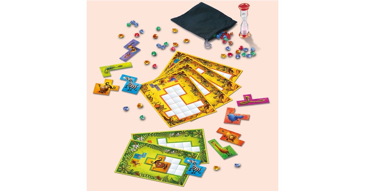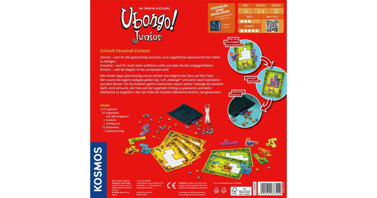 Schnell - einfach - Ubongo! Das Bestsellerspiel - jetzt auch als tierischer Spielspaß für die Jüngsten! Alle Spieler legen gleichzeitig und so schnell wie möglich die Tiere auf ihre Tafel. Der Schnellste ruft "Ubongo!" und zieht rasch Edelsteine aus dem Beutel. Für die Mitspieler geht es inzwischen rasant weiter: Solange die Sanduhr läuft, versuchen auch sie, ihre Tiere auf der Legetafel richtig zu platzieren und dafür Edelsteine zu ergattern. Wer am Ende die meisten Edelsteine besitzt, hat gewonnen. Zwei Schwierigkeitsstufen sorgen dafür, dass es immer spannend bleibt.Art.-Nr.: 1904877