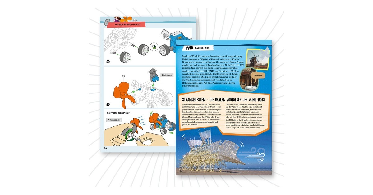 Jetzt wird’s windig! Denn die 6 verschiedenen Modelle werden allein durch Wind angetrieben und sausen durch das Kinderzimmer. Selbst an windstillen Tagen ist das kein Problem – da kommt einfach die praktische handbetriebene Windmaschine zum Einsatz. Egal wie die Wind-Bots fahren, laufen oder krabbeln, alle werden aus den über 100 Einzelteilen zusammengesetzt und können immer wieder aufs Neue umgebaut werden. Ob Flugmaschine, Quad-Läufer, Bohrer-Truck oder einer der anderen Roboter, die Kinder lernen mit ihnen Wind als ein Beispiel für erneuerbare Energien kennen – denn die Bots funktionieren natürlich ganz ohne Batterien. Ein Konstruktions-Spaß von KOSMOS für Kinder zwischen 8 und 12 Jahren, die nur darauf warten, endlich eine Menge Wind abzubekommen!