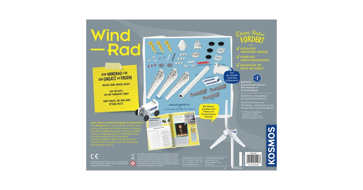 Welcher Neigungswinkel der Rotorblätter ist für welche Windstärke optimal? Einfach ausprobieren! Mit der gewonnenen Energie wird eine aufladbare AA-Batterie für Taschenlampe, Fernbedienung und Co. geladen und aus der Gondel des Windrads lässt sich ein kleines Elektroauto bauen, das mit dem Akku betrieben wird. Die Anleitung des Experimentierkastens zeigt nicht nur Schritt für Schritt, wie das Windrad richtig aufgebaut und eingestellt wird, sondern erklärt auch viel Wissenswertes rund um Erneuerbare Energien und Klimaschutz. Ein toller Start in die Welt der Erneuerbaren Energien für Kinder von 8 bis 14 Jahren.Art.-Nr.: 1864584