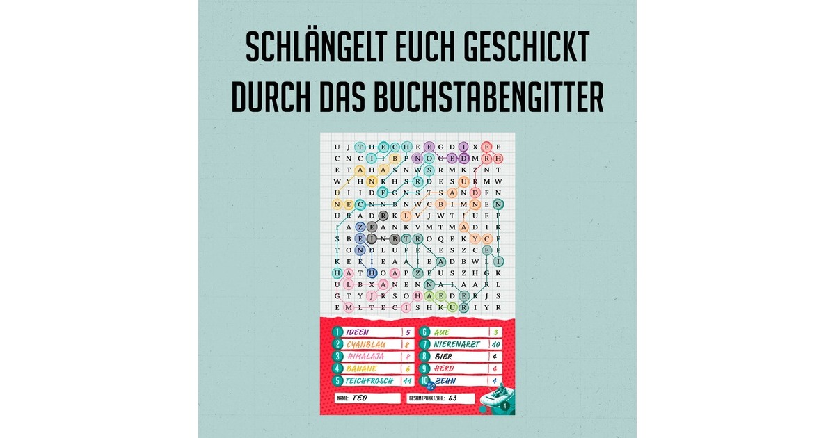 Wörter suchen, finden und sammeln: In diesem cleveren Wortsuchspiel werden über ein Buchstabengitter die passenden Begriffe zu einer Kategorie gesucht. Je länger das Wort, desto mehr Punkte. Aber längere Worte belegen auch mehr Platz auf dem Gitter, so dass es immer kniffeliger wird, die eigenen Wörter zu platzieren. Wer bildet die längste Wortschlange, ohne sich selbst behindern? Art.-Nr.: 1903589| Altersempfehlung | ab 10 Jahren |