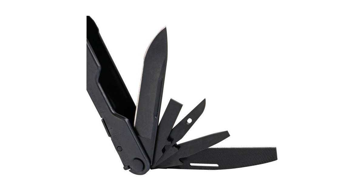 1x Auswechselbarer 154CM Drahtschneider, 1x Auswechselbarer 154CM Hartdrahtschneider, 1xElektro Crimpzange, 1xAbisolierklinge, 1x 420HC Wellenschliffmesser, 1x Ahle mit Öse, 1x Lineal (8 Zoll, 19 cm), 1x Dosenöffner, 1x Flaschenöffner, 1x Holz-/Metall-Feile |