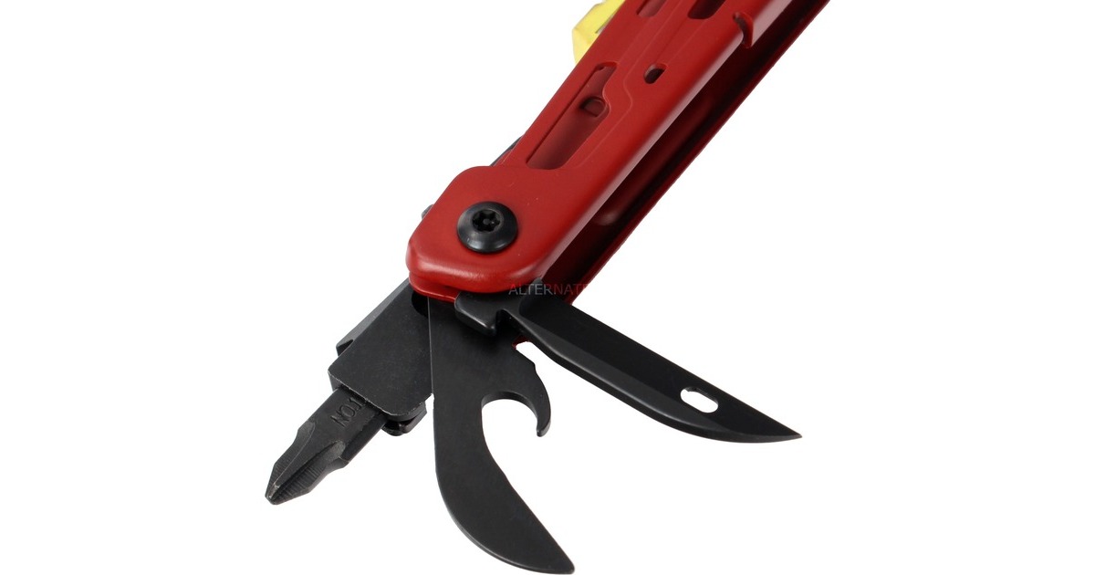 Dosenöffner, Flaschenöffner, Ahle mit Öhr, Karabiner, Signalpfeife, Cereisen Stab, diamantbeschichteter Wetzstab. Bits: #1-2 & 3/16" Kreuzschlitz |