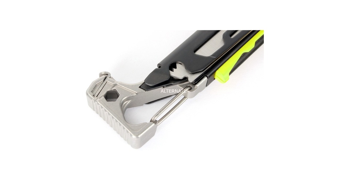 Dosenöffner, Flaschenöffner, Ahle mit Öhr, Karabiner, Signalpfeife, Cereisen Stab, diamantbeschichteter Wetzstab. Bits: #1-2 & 3/16" Kreuzschlitz |
