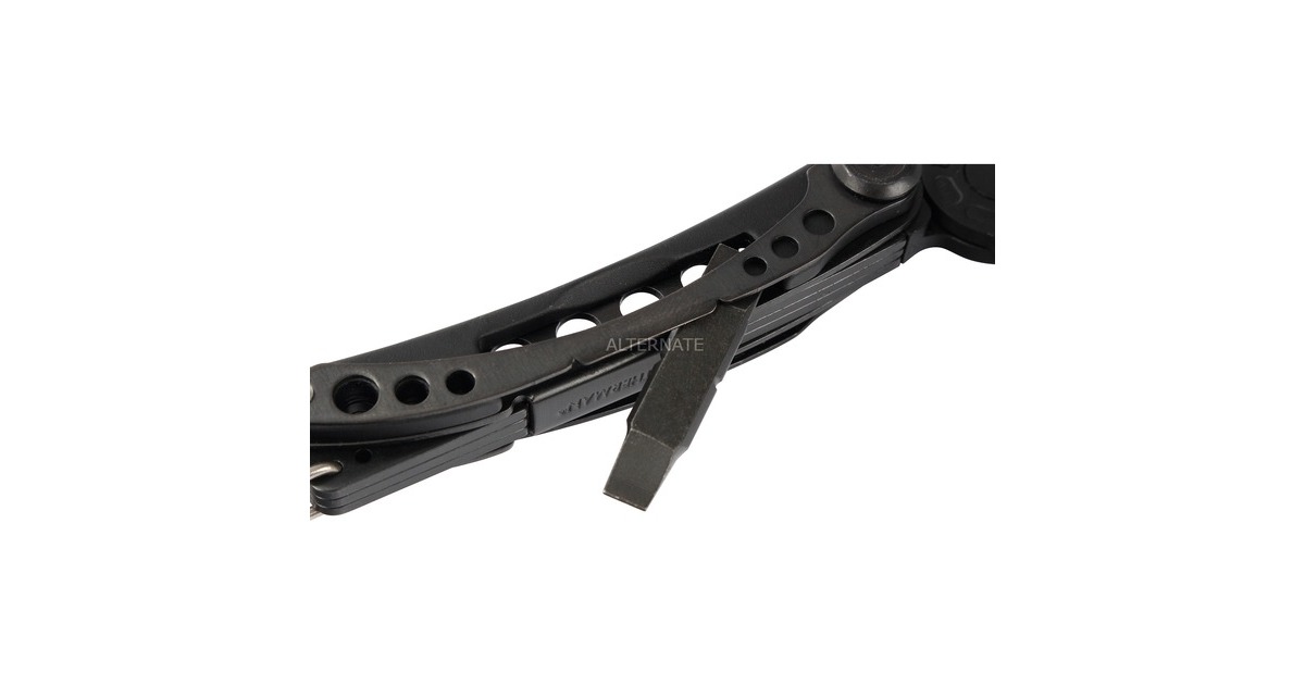 Karabiner, Flaschenöffner. Bits: #1 und #2 Kreuzschlitz, 1/4" und 3/16" Schraubendreher |