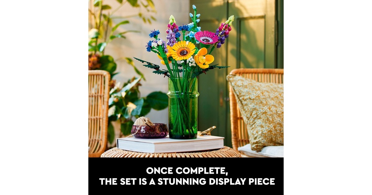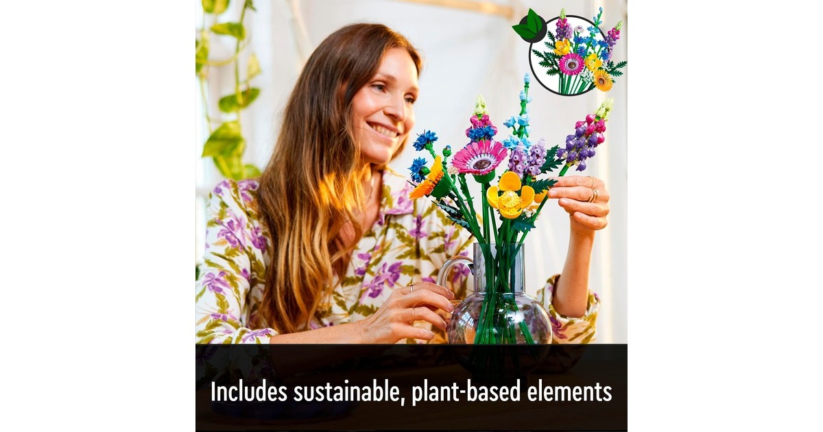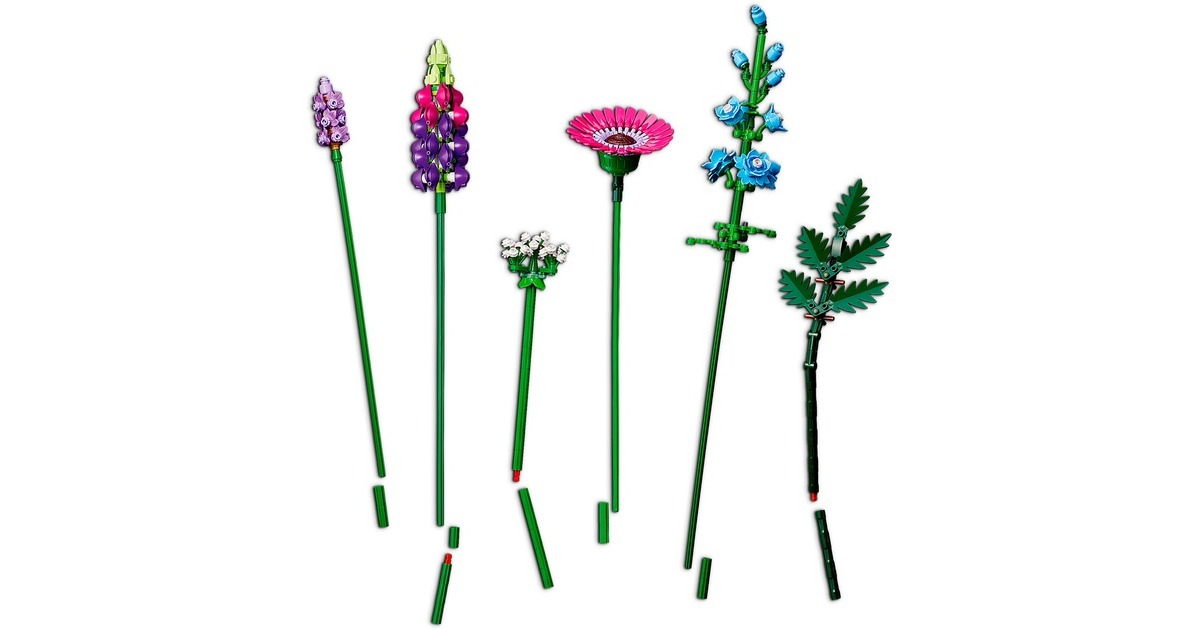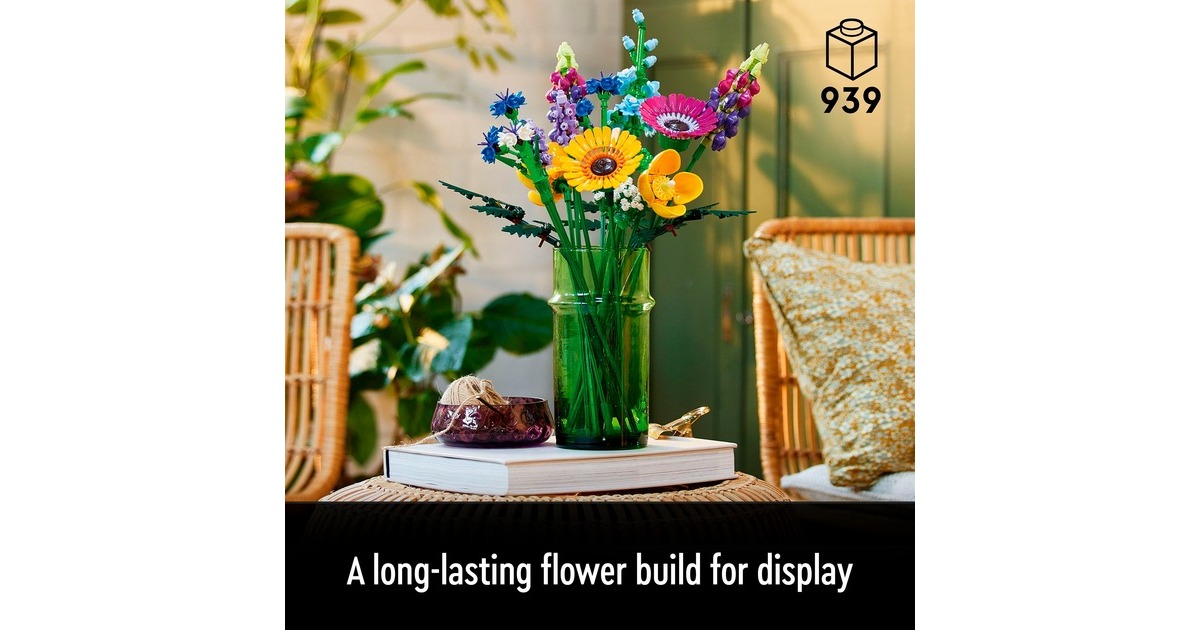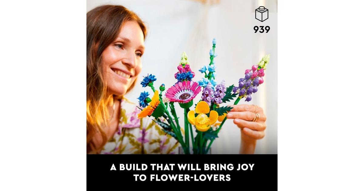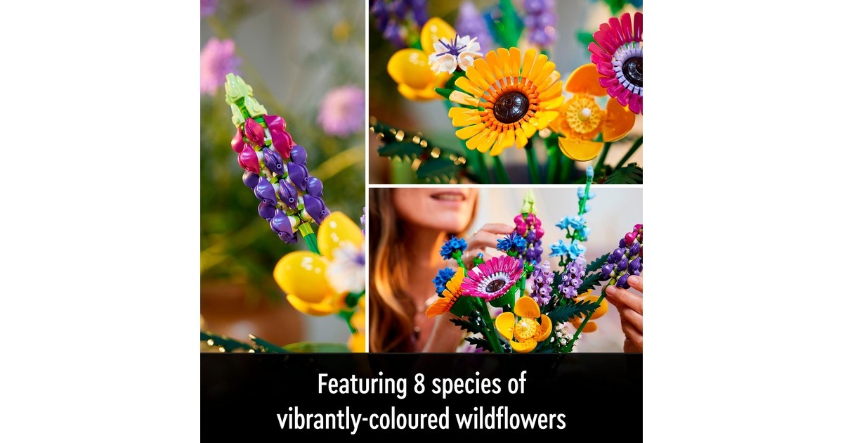 Baue Blumen, die niemals verblühen: Mit diesem Set aus der LEGO-Serie Icons entsteht ein prächtiger Strauß aus Wildblumen - ein stilvoll gestaltetes Kunstwerk, das komplett aus Legosteinen besteht. Dieses farbenfrohe Set zeigt insgesamt acht verschiedene Arten Wildblumen mit verstellbaren Stielen mit den Sorten Kornblume, Lavendel, Klatschmohn, Kuhsilie, Lederfarn, Gerbera, Rittersporn und Lupine. Der Rittersporn erreicht dabei eine Höhe von etwa 47 Zentimetern. Der Strauß lässt sich ganz nach Belieben arrangieren und ausstellen oder mit anderen Sets aus der Botanical Collection von LEGO kombinieren. Ein fesselndes Bauerlebnis für Naturliebhaber oder angehende Floristen. Art.-Nr.: 1871762