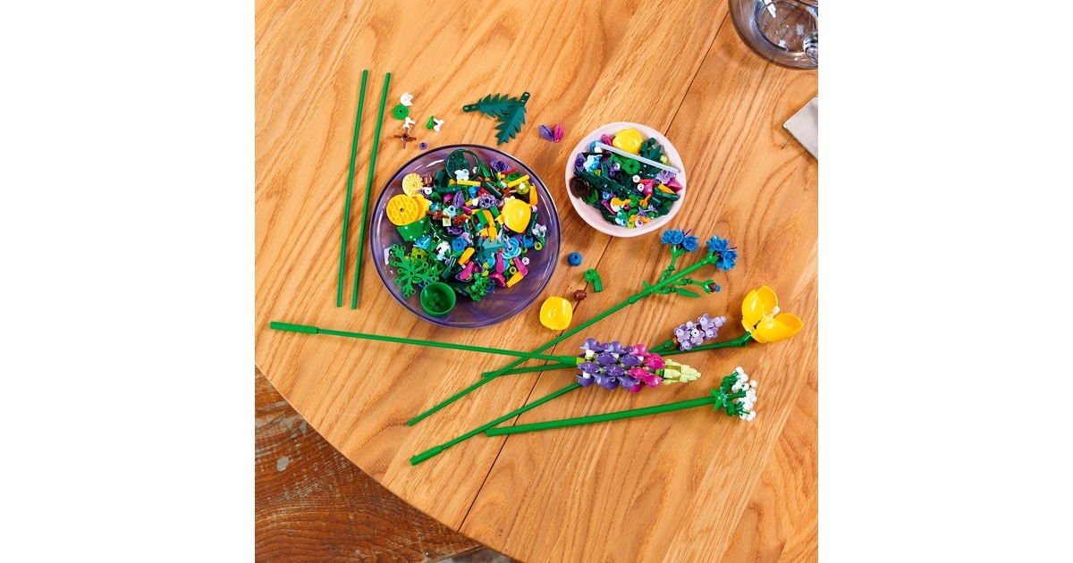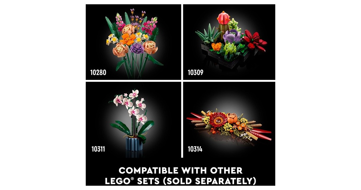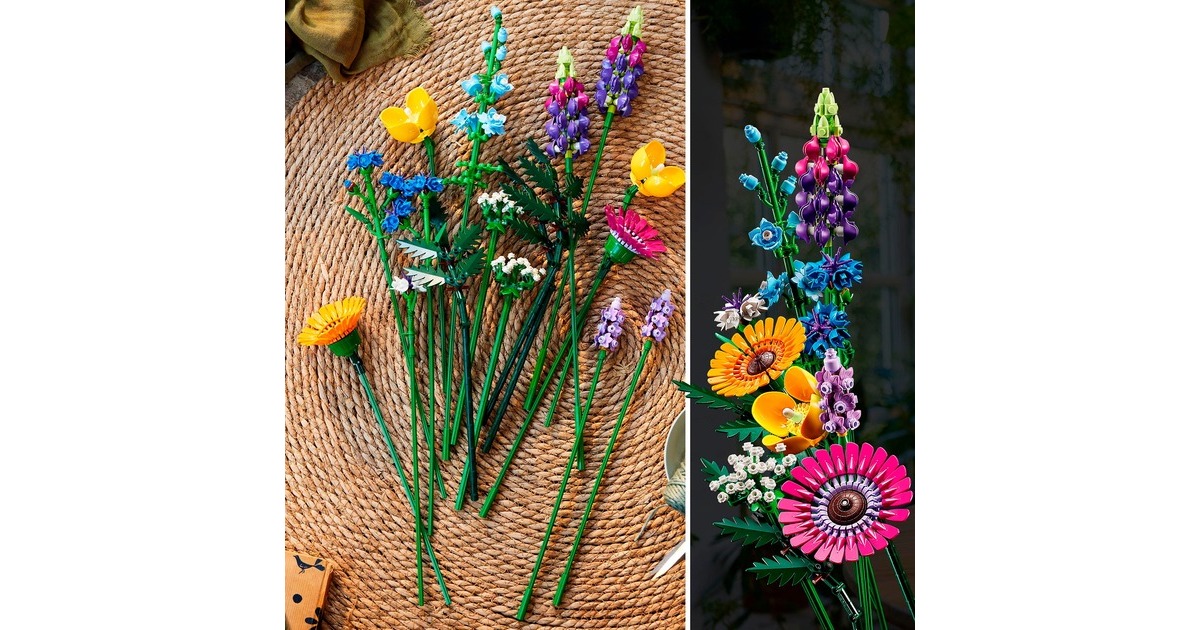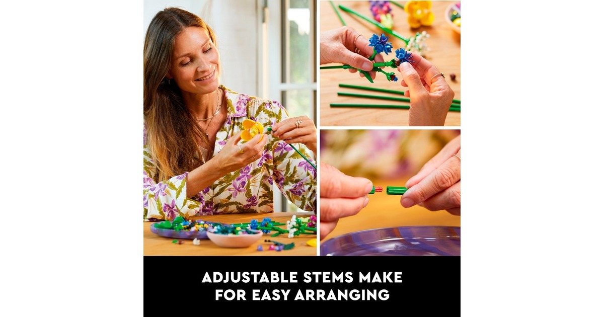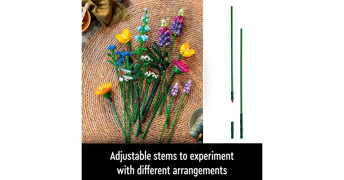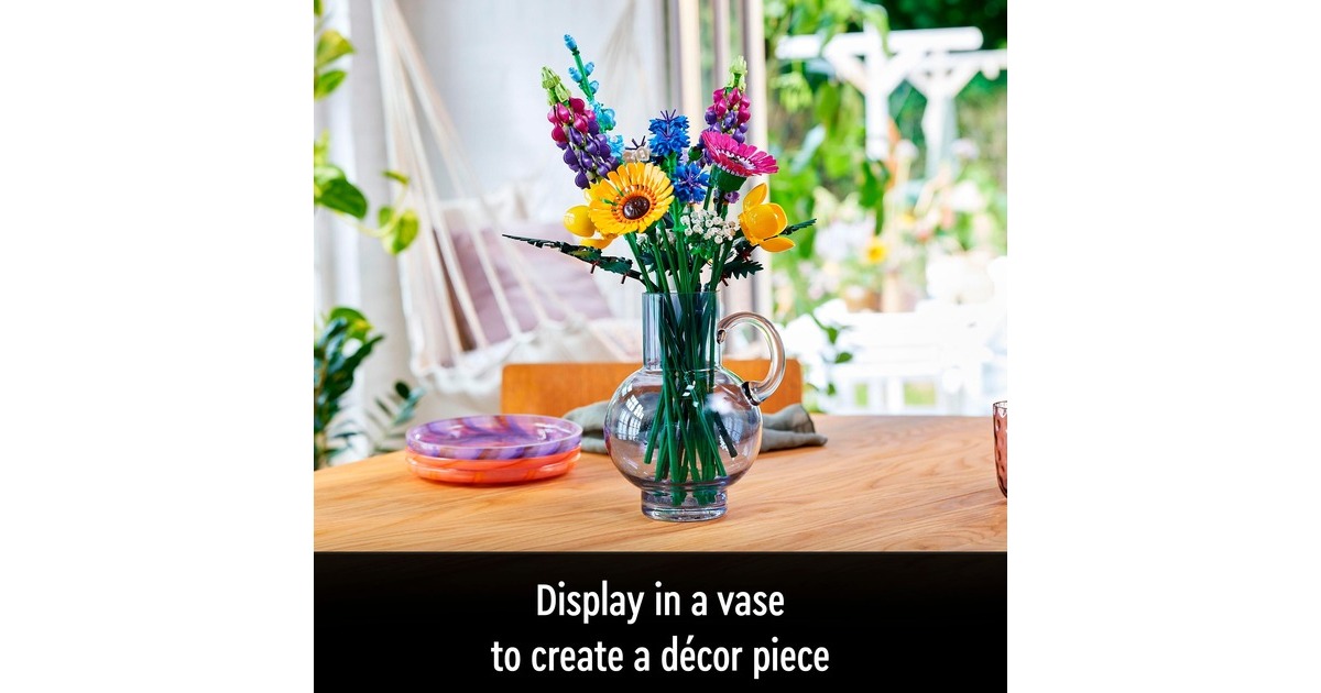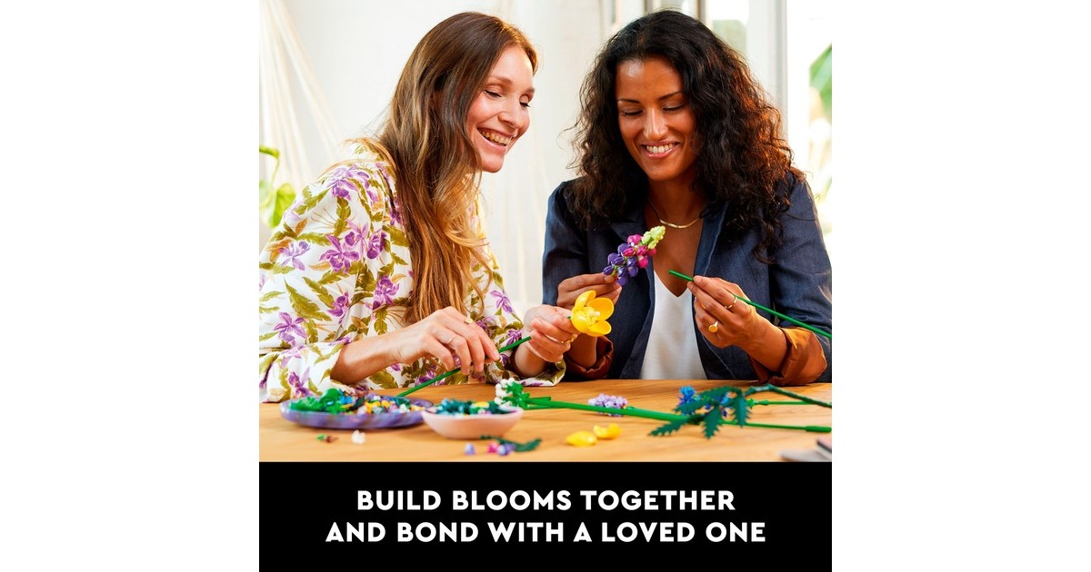 Baue Blumen, die niemals verblühen: Mit diesem Set aus der LEGO-Serie Icons entsteht ein prächtiger Strauß aus Wildblumen - ein stilvoll gestaltetes Kunstwerk, das komplett aus Legosteinen besteht. Dieses farbenfrohe Set zeigt insgesamt acht verschiedene Arten Wildblumen mit verstellbaren Stielen mit den Sorten Kornblume, Lavendel, Klatschmohn, Kuhsilie, Lederfarn, Gerbera, Rittersporn und Lupine. Der Rittersporn erreicht dabei eine Höhe von etwa 47 Zentimetern. Der Strauß lässt sich ganz nach Belieben arrangieren und ausstellen oder mit anderen Sets aus der Botanical Collection von LEGO kombinieren. Ein fesselndes Bauerlebnis für Naturliebhaber oder angehende Floristen. Art.-Nr.: 1871762