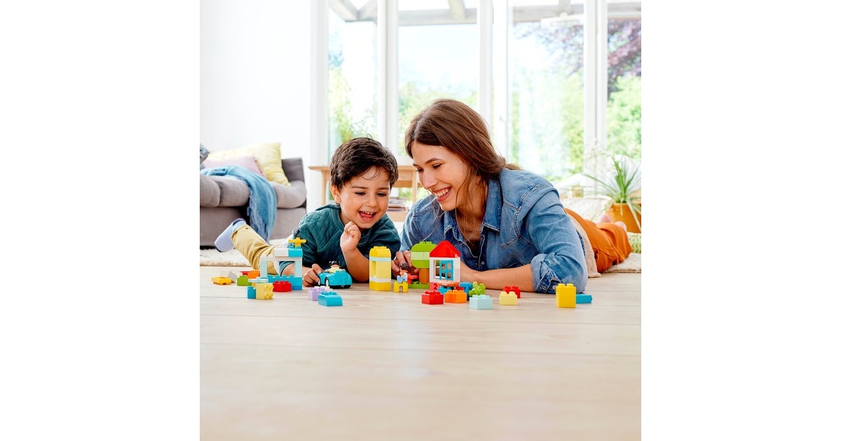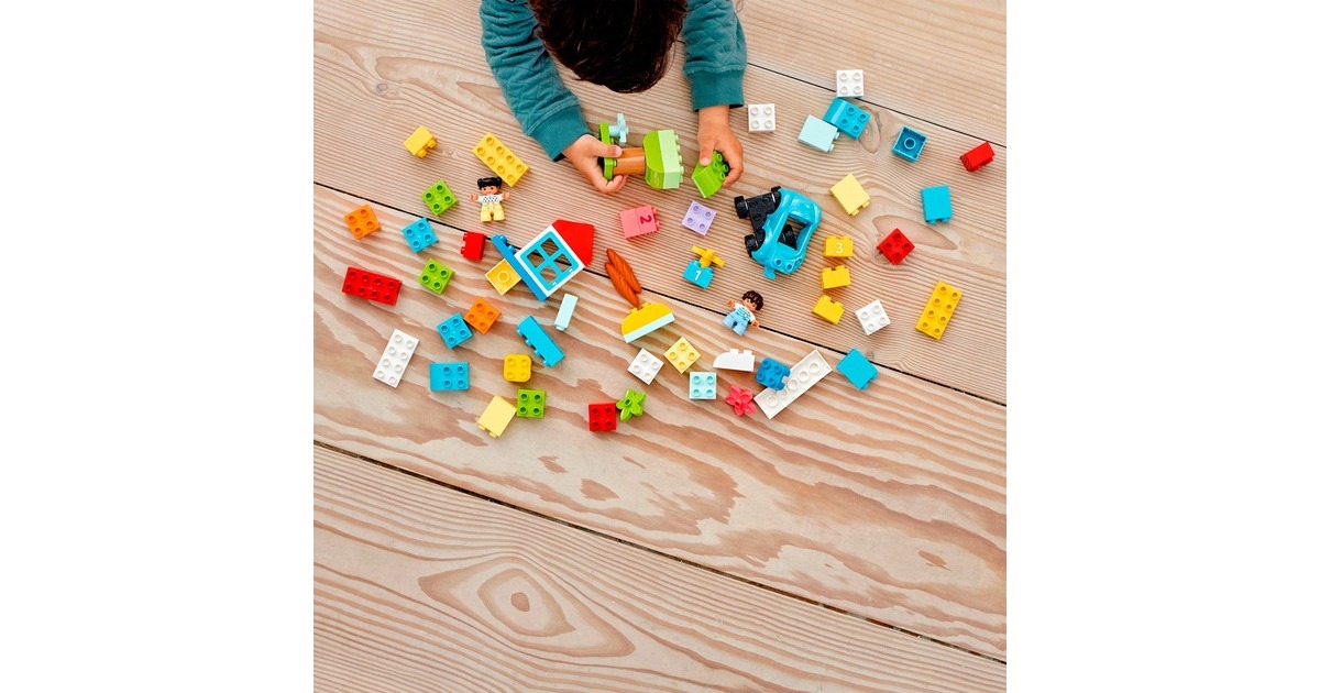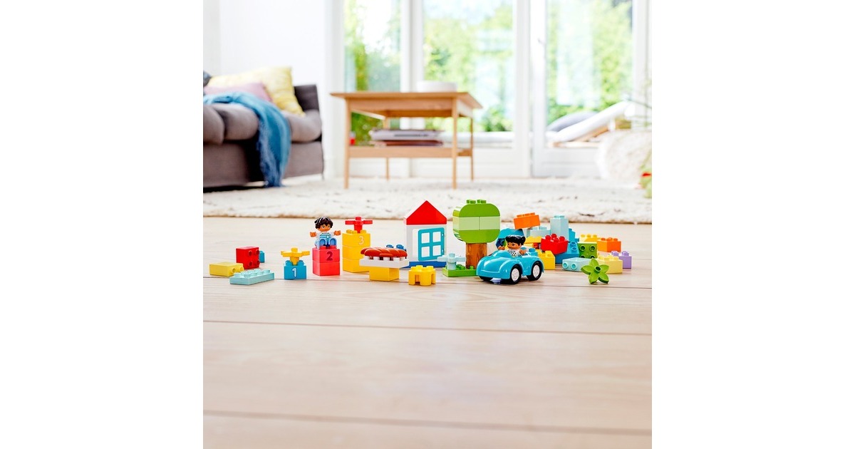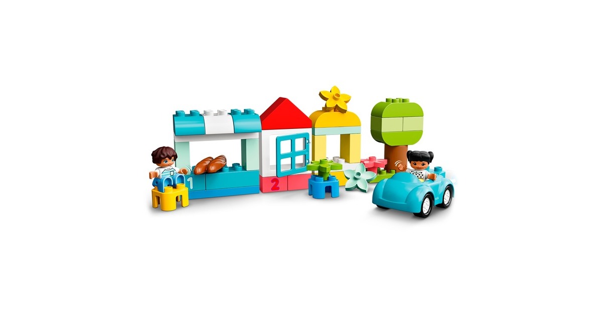 Dieses entwicklungsfördernde Spielzeug enthält jede Menge Steine und Elemente, um Kleinkinder aktiv, kreativ und fantasievoll spielen zu lassen. Vertraute Objekte und farbenfrohe Formen regen Kleinkinder zum freien Bauen und Spielen an. Deshalb ist dieses LEGO DUPLO Starter-Set der perfekte Einstieg für junge Baumeister. Lernspielzeug für Kleinkinder! Die robuste Aufbewahrungsbox enthält ein Auto mit drehenden Rädern, ein Dach, ein Fenster, Blumen, Brot, DUPLO Figuren, nummerierte Steine sowie verschiedene originelle Steine in ansprechenden Farben. Die Eltern werden große Freude daran haben, wichtige Entwicklungsschritte mitzuerleben, wenn die kleinen Baumeister die Steine und Elemente zusammenfügen und die unzähligen Spielmöglichkeiten nutzen. Tolles Geschenk für Kleinkinder! LEGO DUPLO Spielsets bieten aufstrebenden Baumeistern unzählige aktive Spiel- und Ausdrucksmöglichkeiten. Die bunten, leicht greifbaren und sicheren Steine und Elemente regen die Fantasie der Kleinkinder an. Sie lassen sich auch leicht reinigen und überall mitnehmen.Art.-Nr.: 1583334