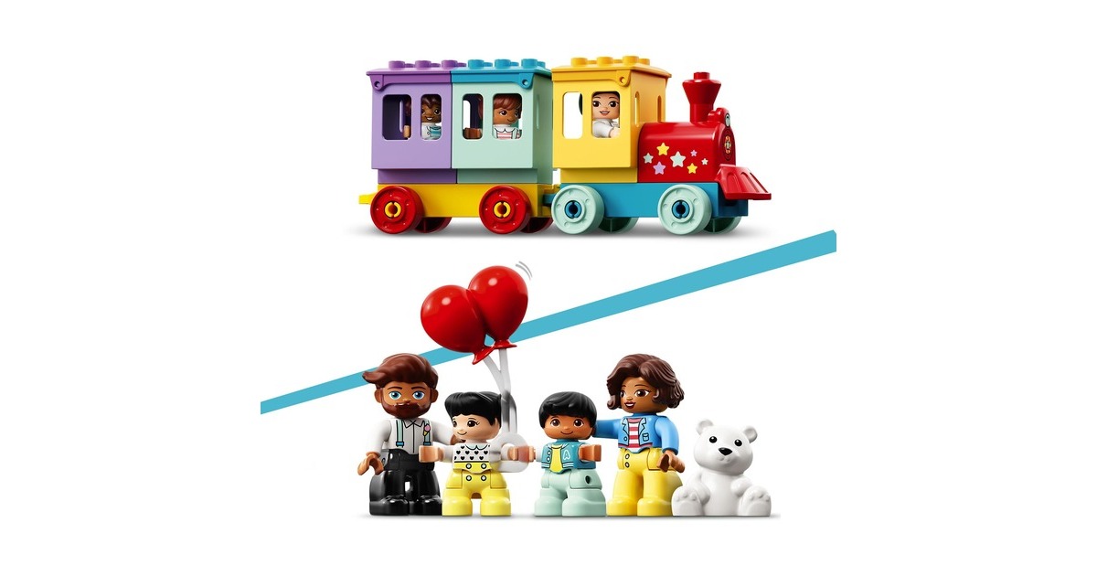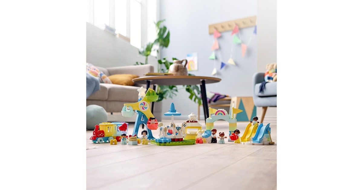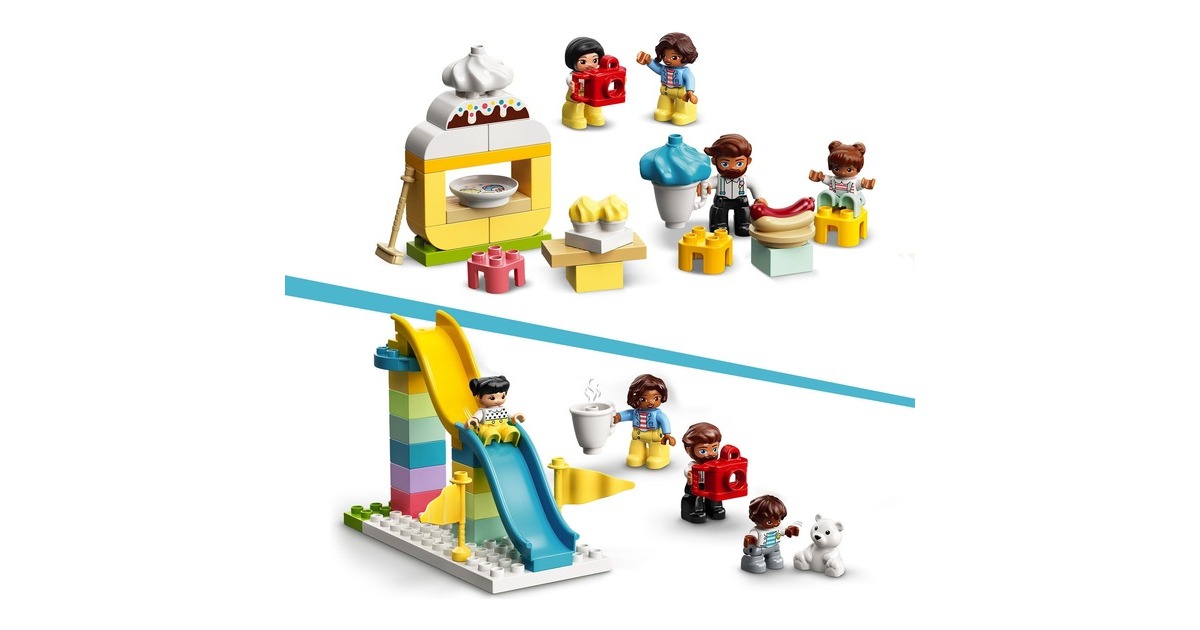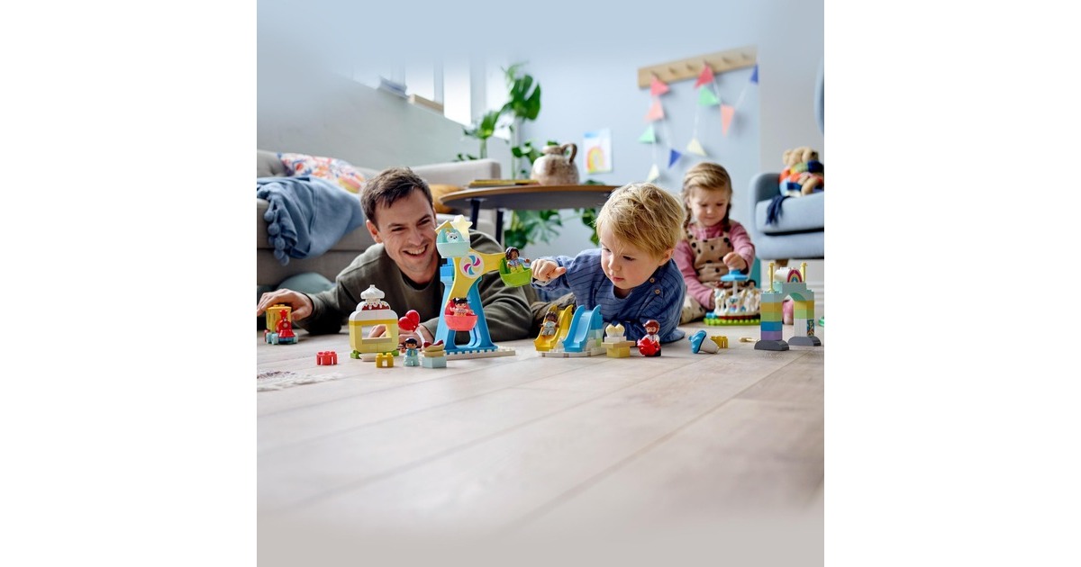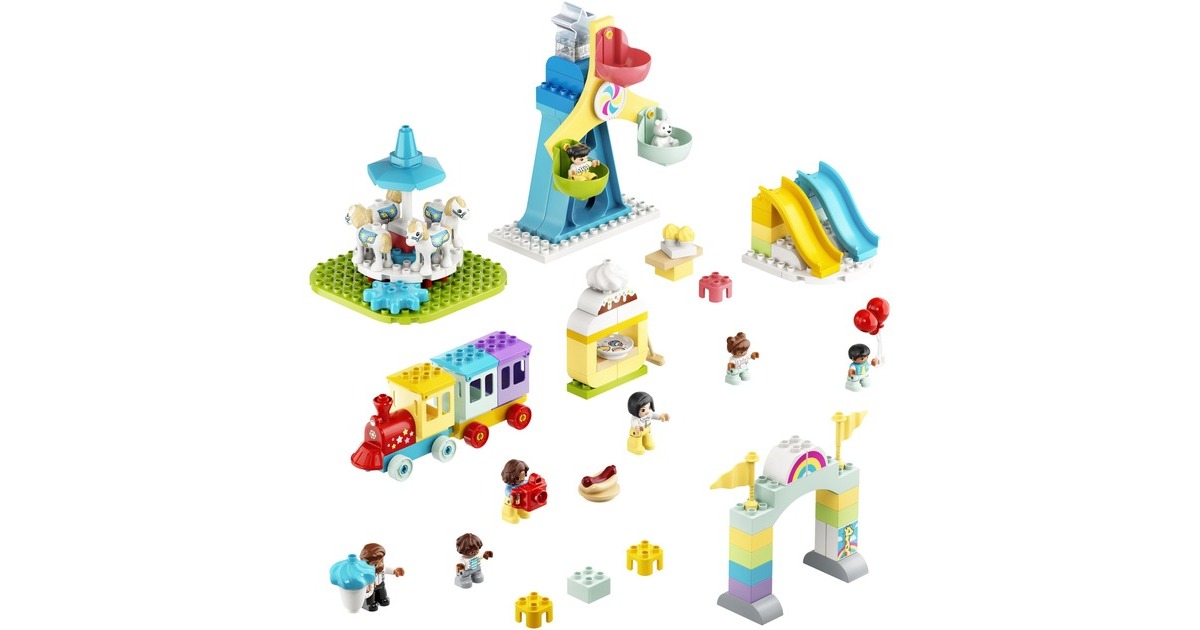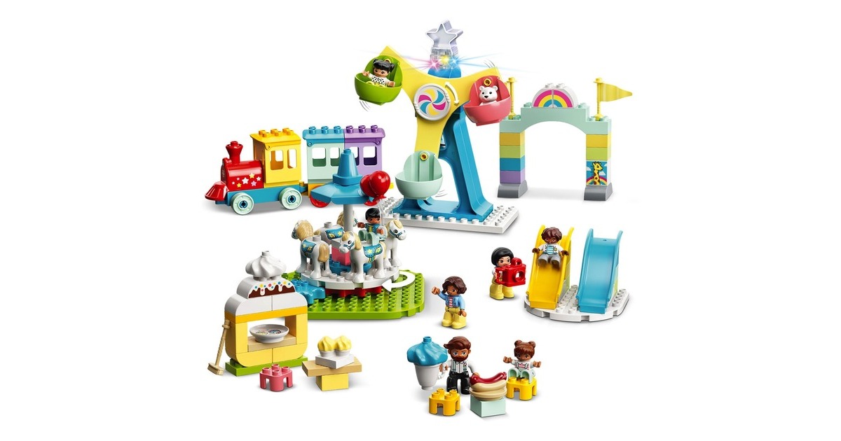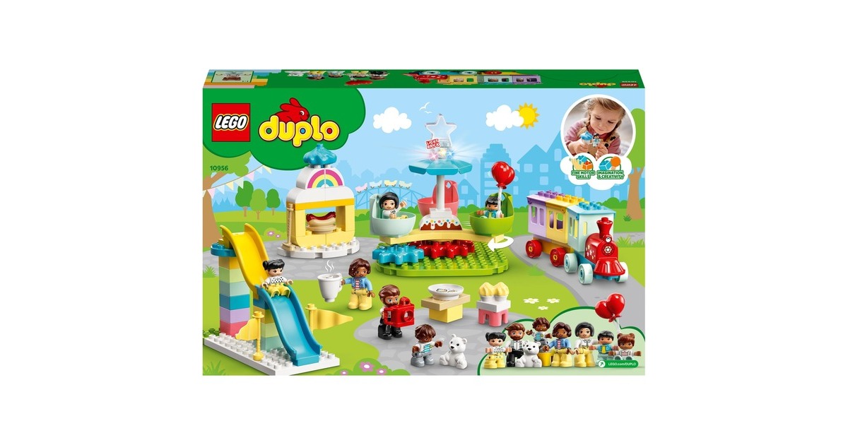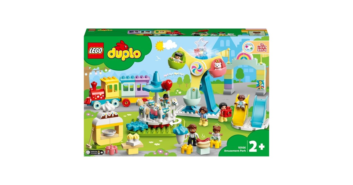 Begleite dein Kleinkind auf einen fantasievollen Ausflug in den LEGO DUPLO Erlebnispark (10956). Erkundet die verschiedenen Attraktionen, die junge Kinder anregen und ihre Entwicklung fördern. Familienspaß auf dem Jahrmarkt! Begleite 7 LEGO DUPLO Figuren – Zwei Frauen, ein Mann und vier Kinder – auf den tollen Jahrmarkt! Dieses facettenreiche Spielset beinhaltet Rutschen, ein Karussell, ein großes Riesenrad mit drei bunten Gondeln und einen Zug für Fahrten durch den Park. Du kannst dir auch Hotdogs kaufen. Eis, eine Kamera, Luftballons, Cupcakes, ein Besen und ein Teddybär laden ebenfalls zum Spielen ein. Eine Regenbogenlampe, die ihre Farbe wechselt, erzeugt authentische Jahrmarktstimmung. Entwicklungsförderndes Spielzeug für Kleinkinder: Mit LEGO DUPLO Spielzeug lernen Vorschulkinder ganz spielerisch. LEGO DUPLO Spielsets lassen Eltern und Kleinkinder miteinander bauen und spielen und wichtige Entwicklungsschritte gemeinsam erleben.Art.-Nr.: 1735817