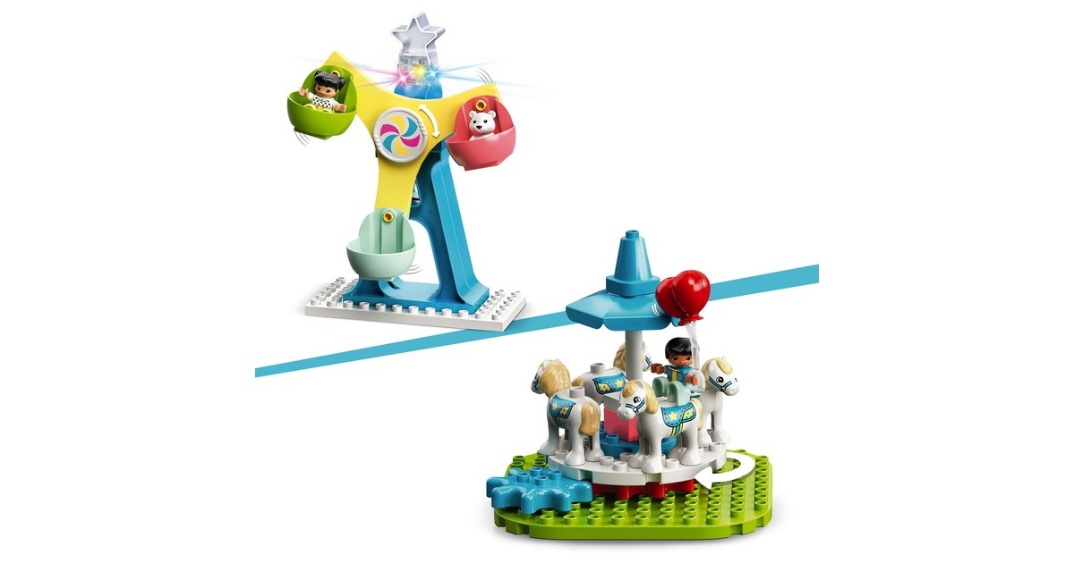 Beinhaltet 7 LEGO DUPLO Figuren – zwei Frauen, ein Mann und vier Kinder – zwei Rutschen, ein Karussell mit Drehmechanik, ein drehbares Riesenrad mit drei bunten Gondeln, einen Schiebezug und viele witzige Extras. Zubehörelemente wie Hotdogs, Eis, eine Kamera, Luftballons, Cupcakes, ein Besen und ein Teddybär regen zu unzähligen Rollenspielen an. Eine Regenbogenlampe, die ihre Farben wechselt, ist ebenfalls enthalten |